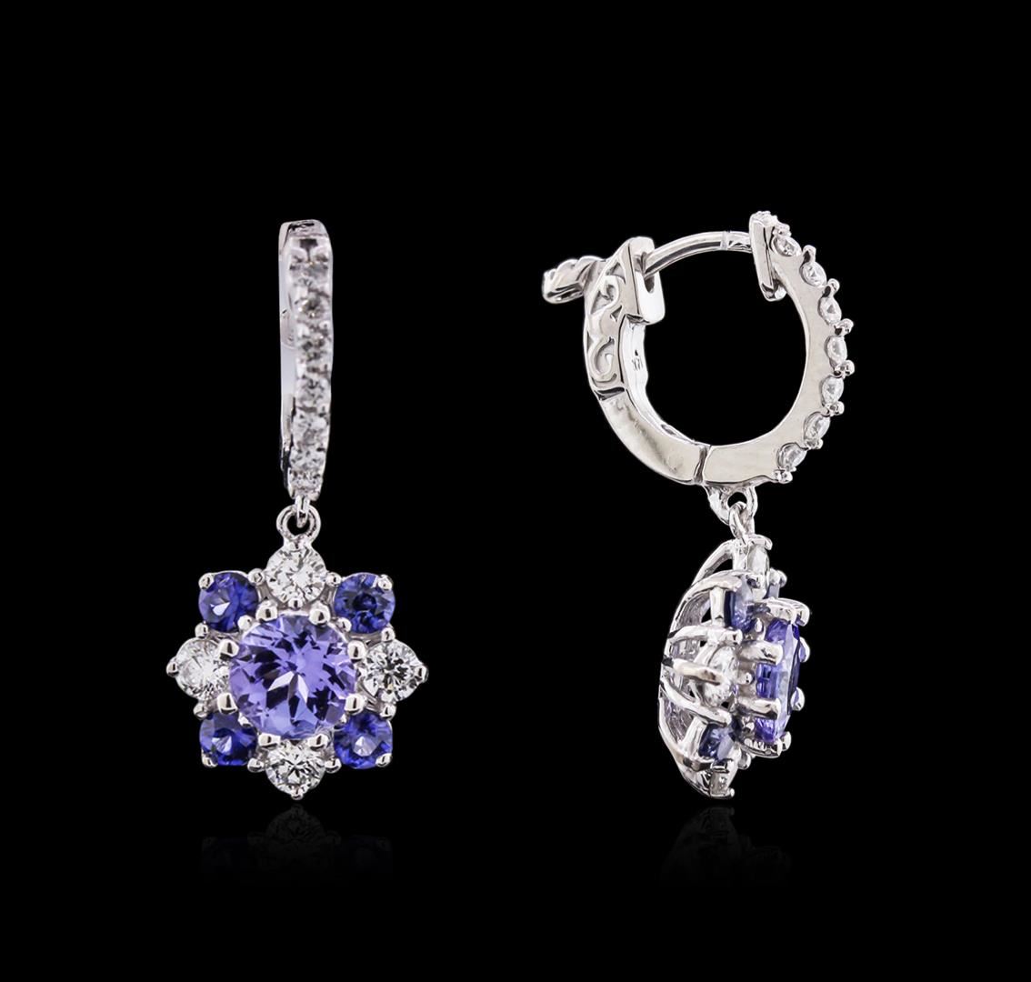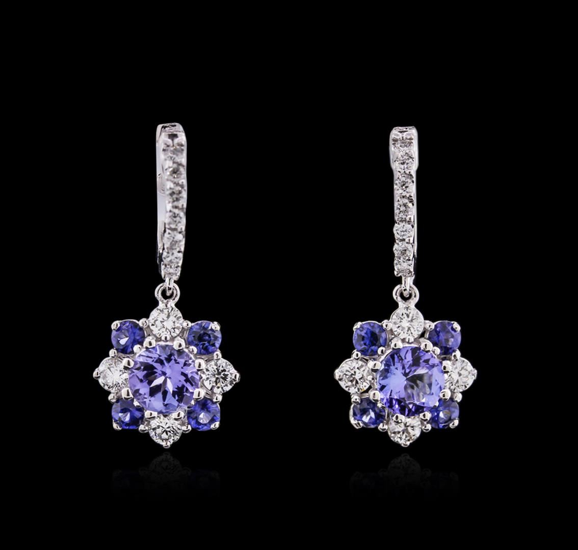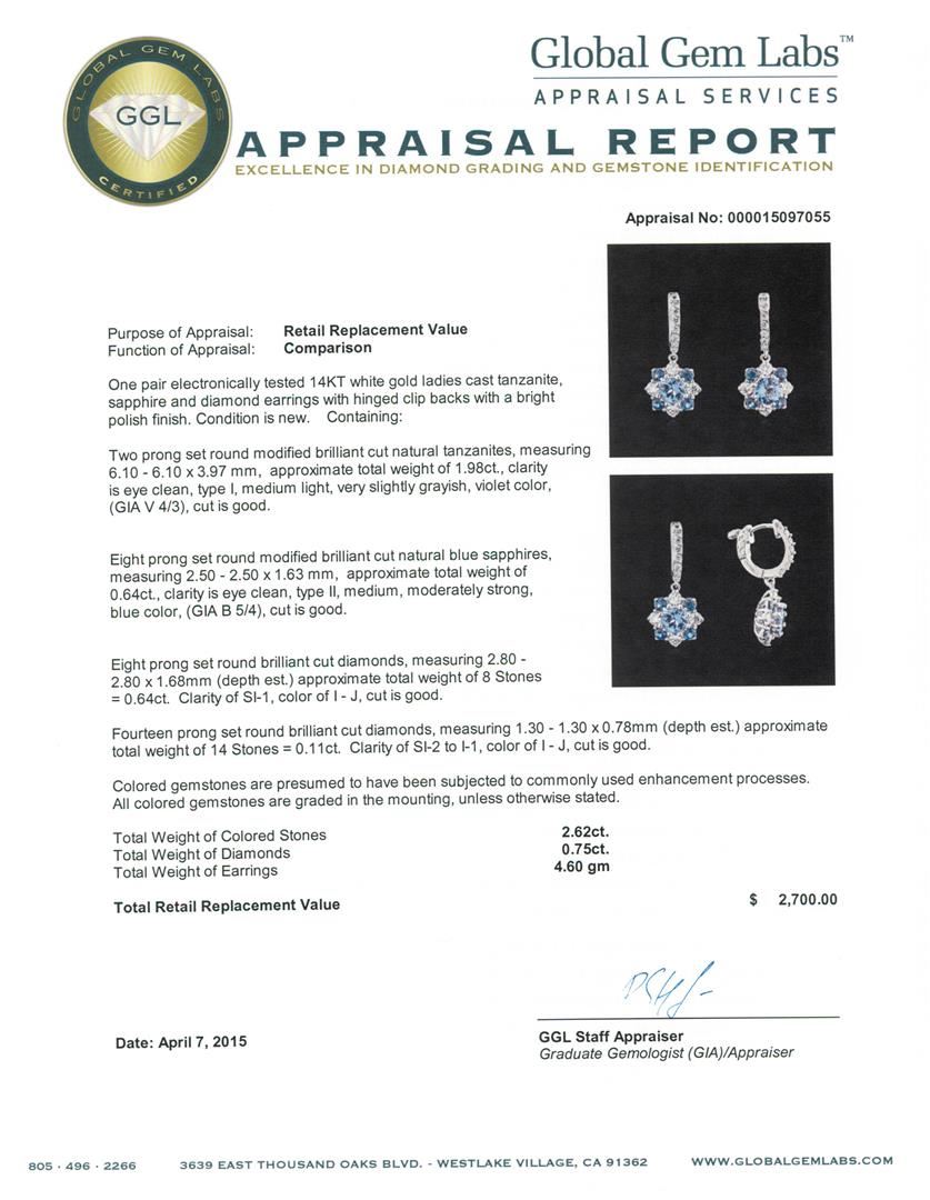 One pair electronically tested 14KT white gold ladies cast tanzanite, sapphire and diamond earrings with hinged clip backs with a bright polish finish. Condition is new. Containing: Two prong set round modified brilliant cut natural tanzanites, measuring 6.10 - 6.10 x 3.97 mm, approximate total weight of 1.98ct., clarity is eye clean, type I, medium light, very slightly grayish, violet color, (GIA V 4/3), cut is good. Eight prong set round modified brilliant cut natural blue sapphires, measuring 2.50 - 2.50 x 1.63 mm, approximate total weight of 0.64ct., clarity is eye clean, type II, medium, moderately strong, blue color, (GIA B 5/4), cut is good. Eight prong set round brilliant cut diamonds, measuring 2.80 - 2.80 x 1.68mm (depth est.) approximate total weight of 8 Stones = 0.64ct. Clarity: SI-1. Color: I - J, Cut is Good. Fourteen prong set round brilliant cut diamonds, measuring 1.30 - 1.30 x 0.78mm (depth est.) approximate total weight of 14 Stones = 0.11ct. Clarity: SI-2 to I-1. Color: I - J, Cut is Good. Colored gemstones are presumed to have been subjected to commonly used enhancement processes. All colored gemstones are graded in the mounting, unless otherwise stated. Total Weight of Colored Stones 2.62ct. Total Weight of Diamonds 0.75ct. Total Weight of Earrings 4.60 grams. GGL Appraised at $2,700.00.