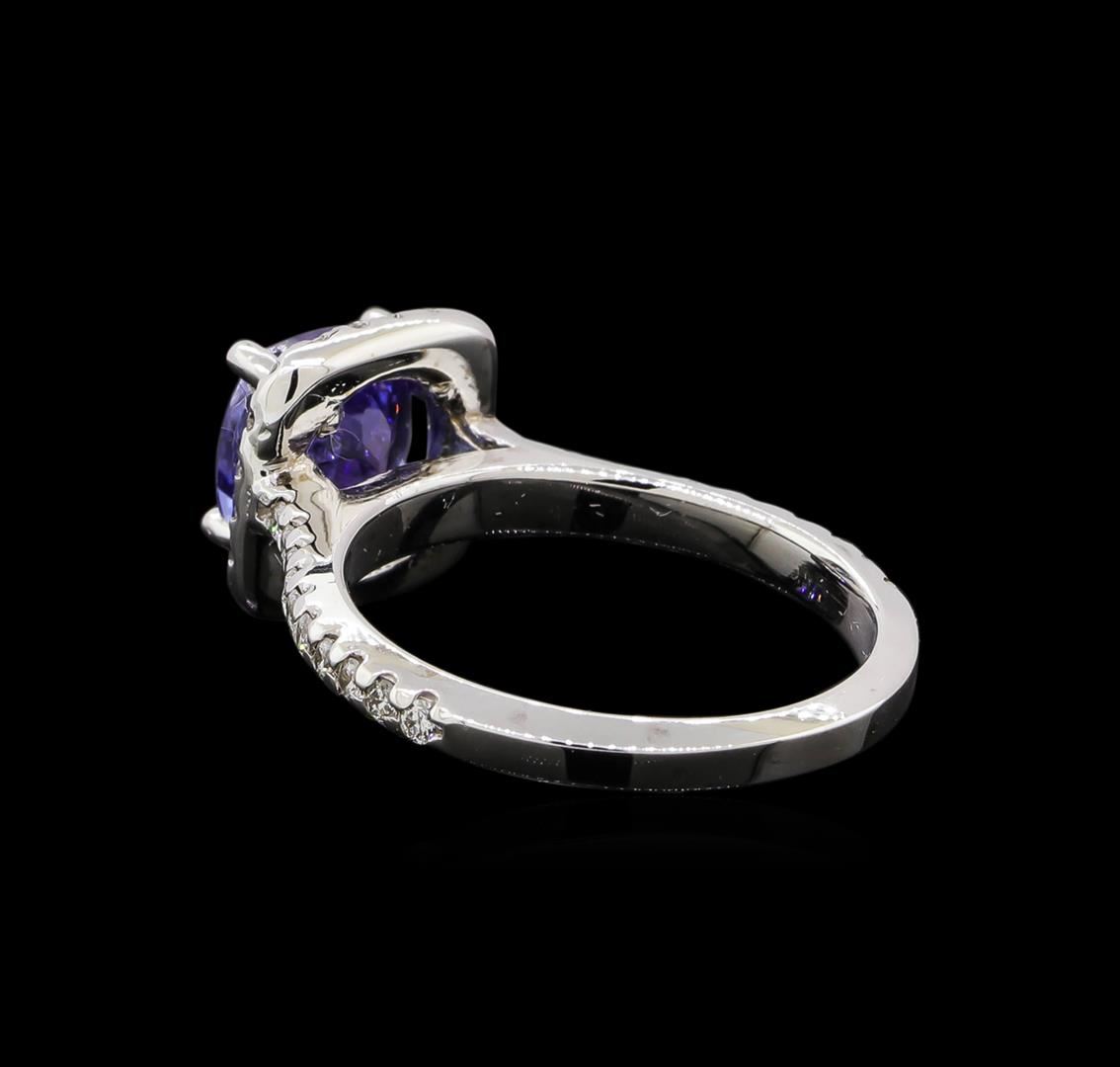 One electronically tested 14KT white gold ladies cast tanzanite and diamond ring with a bright polish finish. Identified with markings of "14K". Condition is new. Containing: One prong set square cushion modified brilliant cut natural tanzanite, measuring 7.30 x 7.30 x 4.75mm, approximate weight of 1.99ct., clarity is eye clean, type I, medium light, very slightly grayish, violet color, (GIA V 4/3), cut is good. Forty prong set round brilliant cut diamonds, measuring 1.50 - 1.50 x 0.90mm (depth est.) approximate total weight of 40 Stones = 0.49ct. Clarity: SI-1 to SI-2. Color: I - J, Cut is Good. Colored gemstones are presumed to have been subjected to commonly used enhancement processes. All diamonds and colored gemstones are graded in the mounting, unless otherwise stated. Total Weight of Colored Stones 1.99ct. Total Weight of Diamonds 0.49ct. Total Weight of Ring 4.30 grams. GGL Appraised at $3,060.00.