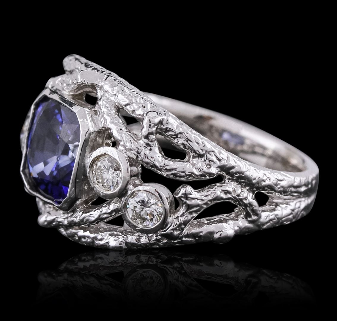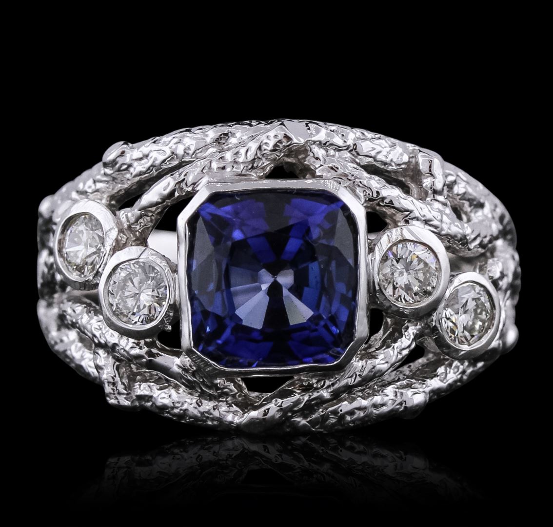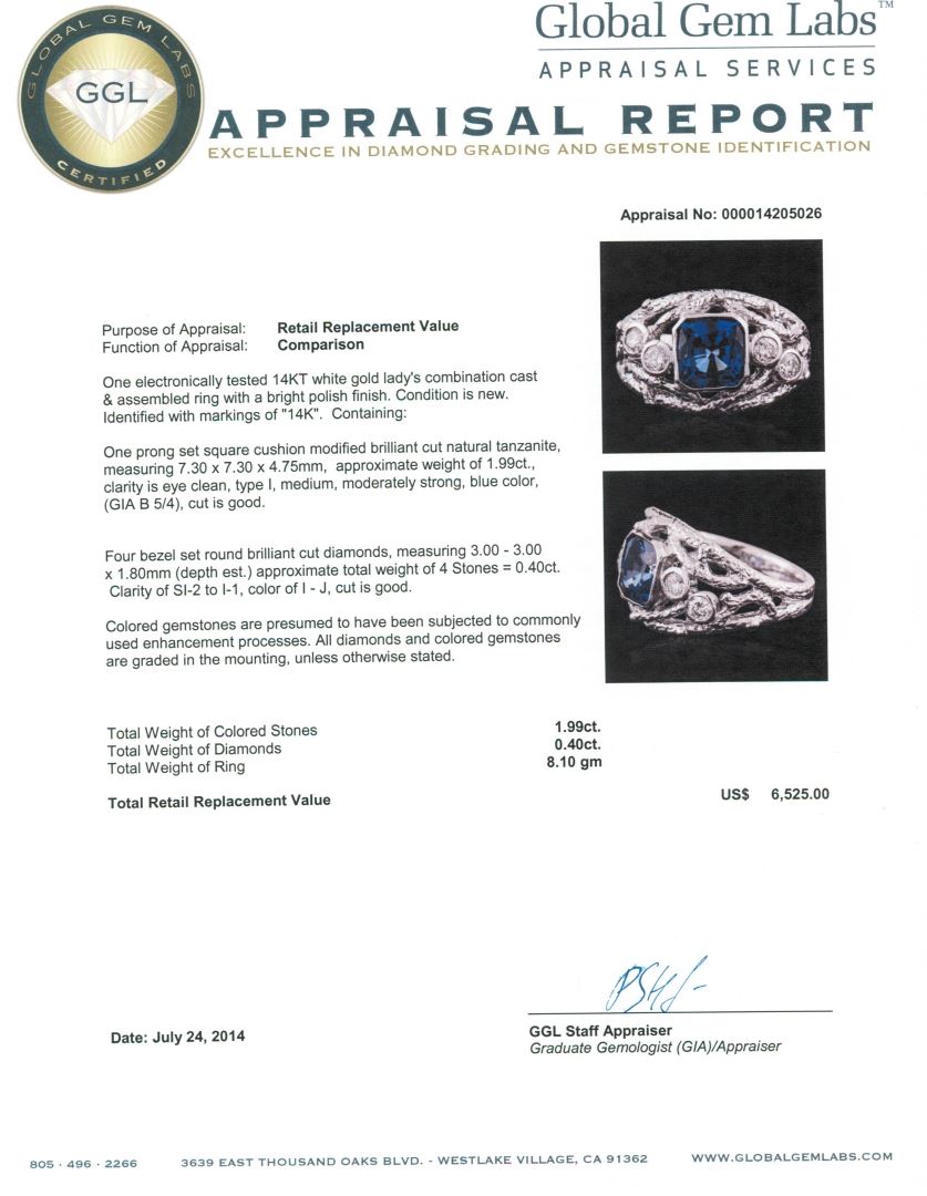 One electronically tested 14KT white gold ladies combination cast & assembled ring with a bright polish finish. Condition is new. Identified with markings of "14K". Containing: One prong set square cushion modified brilliant cut natural tanzanite, measuring 7.30 x 7.30 x 4.75mm, approximate weight of 1.99ct., clarity is eye clean, type I, medium, moderately strong, blue color, (GIA B 5/4), cut is good. Four bezel set round brilliant cut diamonds, measuring 3.00 - 3.00 x 1.80mm (depth est.) approximate total weight of 4 Stones = 0.40ct. Clarity: SI-2 to I-1. Color: I - J, Cut is Good. Colored gemstones are presumed to have been subjected to commonly used enhancement processes. All diamonds and colored gemstones are graded in the mounting, unless otherwise stated. Total Weight of Colored Stones 1.99ct. Total Weight of Diamonds 0.40ct. Total Weight of Ring 8.10 grams. GGL Appraised at $6,525.00.