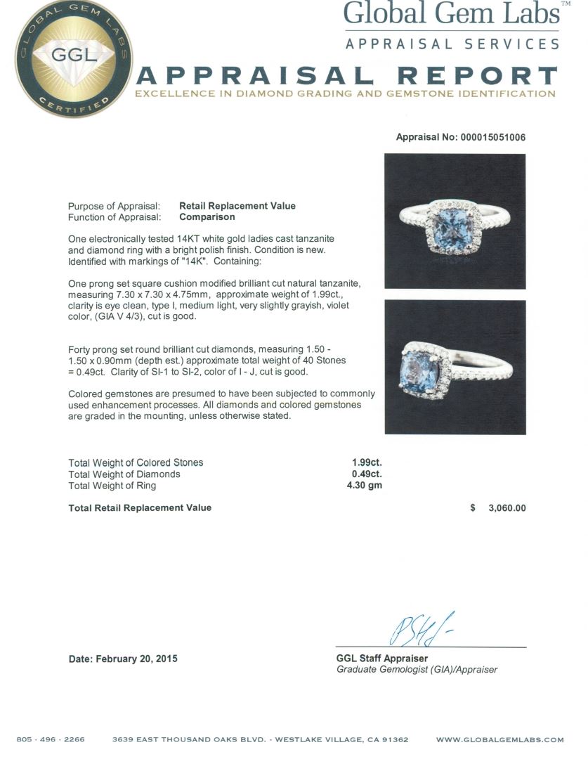 One electronically tested 14KT white gold ladies cast tanzanite and diamond ring with a bright polish finish. Identified with markings of "14K". Condition is new. Containing: One prong set square cushion modified brilliant cut natural tanzanite, measuring 7.30 x 7.30 x 4.75mm, approximate weight of 1.99ct., clarity is eye clean, type I, medium light, very slightly grayish, violet color, (GIA V 4/3), cut is good. Forty prong set round brilliant cut diamonds, measuring 1.50 - 1.50 x 0.90mm (depth est.) approximate total weight of 40 Stones = 0.49ct. Clarity: SI-1 to SI-2. Color: I - J, Cut is Good. Colored gemstones are presumed to have been subjected to commonly used enhancement processes. All diamonds and colored gemstones are graded in the mounting, unless otherwise stated. Total Weight of Colored Stones 1.99ct. Total Weight of Diamonds 0.49ct. Total Weight of Ring 4.30 grams. GGL Appraised at $3,060.00.
