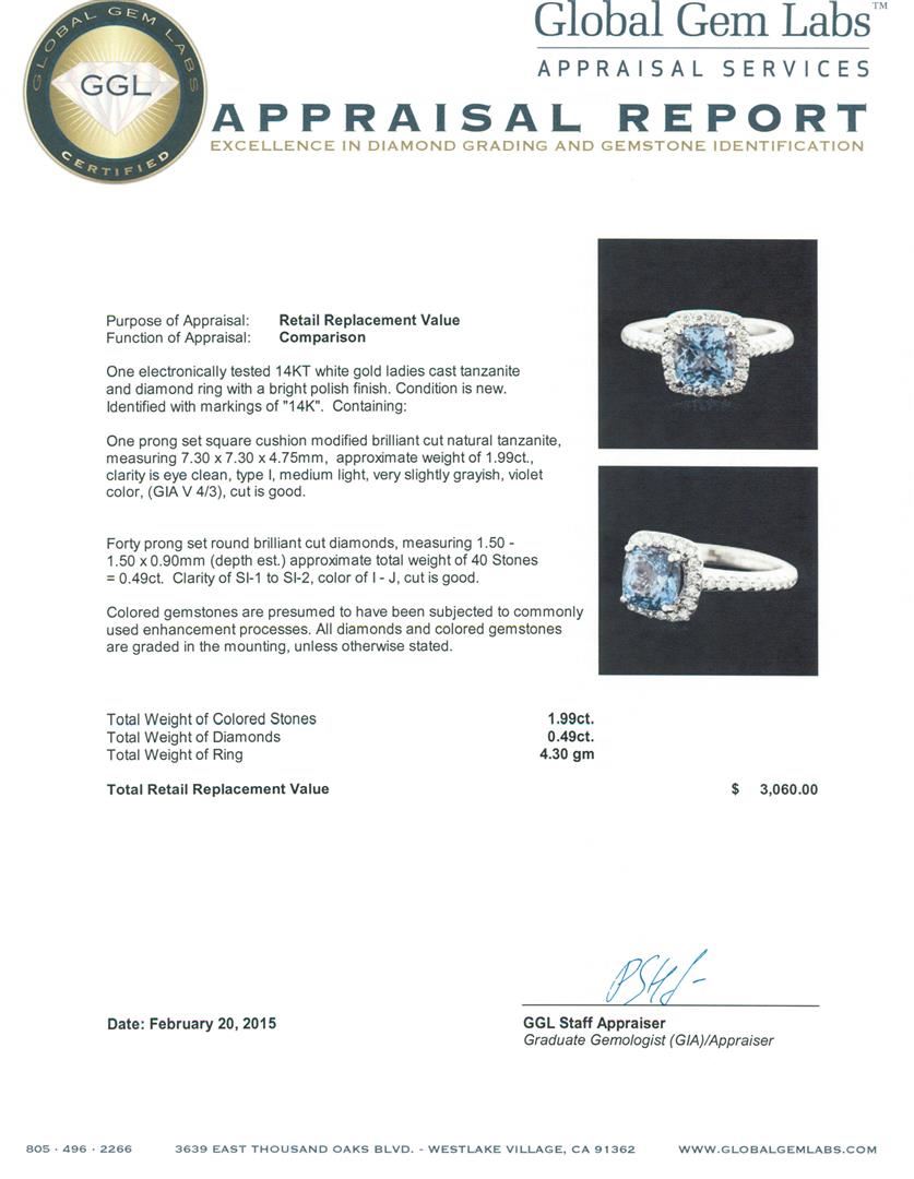 One electronically tested 14KT white gold ladies cast tanzanite and diamond ring with a bright polish finish. Identified with markings of "14K". Condition is new. Containing: One prong set square cushion modified brilliant cut natural tanzanite, measuring 7.30 x 7.30 x 4.75mm, approximate weight of 1.99ct., clarity is eye clean, type I, medium light, very slightly grayish, violet color, (GIA V 4/3), cut is good. Forty prong set round brilliant cut diamonds, measuring 1.50 - 1.50 x 0.90mm (depth est.) approximate total weight of 40 Stones = 0.49ct. Clarity: SI-1 to SI-2. Color: I - J, Cut is Good. Colored gemstones are presumed to have been subjected to commonly used enhancement processes. All diamonds and colored gemstones are graded in the mounting, unless otherwise stated. Total Weight of Colored Stones 1.99ct. Total Weight of Diamonds 0.49ct. Total Weight of Ring 4.30 grams. GGL Appraised at $3,060.00.