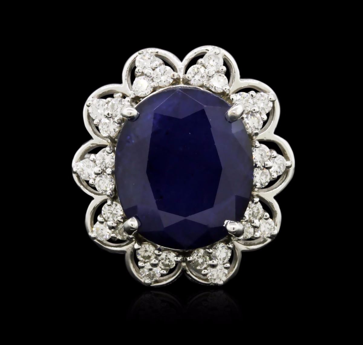 One electronically tested 14KT white gold ladies cast sapphire and diamond ring with a bright polish finish. Identified with markings of "14K". Condition is new. Containing: One prong set oval modified brilliant cut natural blue sapphire, measuring 14.25 x 12.17 x 6.95mm, approximate weight of 10.12ct., clarity is heavily included, type II, dark, strong, blue color, (GIA B 7/5), cut is good. Thirty prong set round brilliant cut diamonds, measuring 1.80 - 1.80 x 1.08mm (depth est.) approximate total weight of 30 Stones = 0.64ct. Clarity: SI-1 to I-1. Color: H - I, Cut is Good. Colored gemstones are presumed to have been subjected to commonly used enhancement processes. All diamonds and colored gemstones are graded in the mounting, unless otherwise stated. Total Weight of Colored Stones 10.12ct. Total Weight of Diamonds 0.64ct. Total Weight of Ring 7.80 grams. GGL Appraised at $4,075.00.