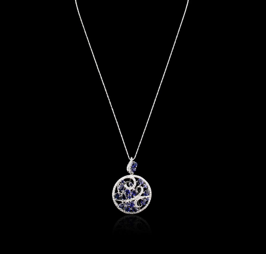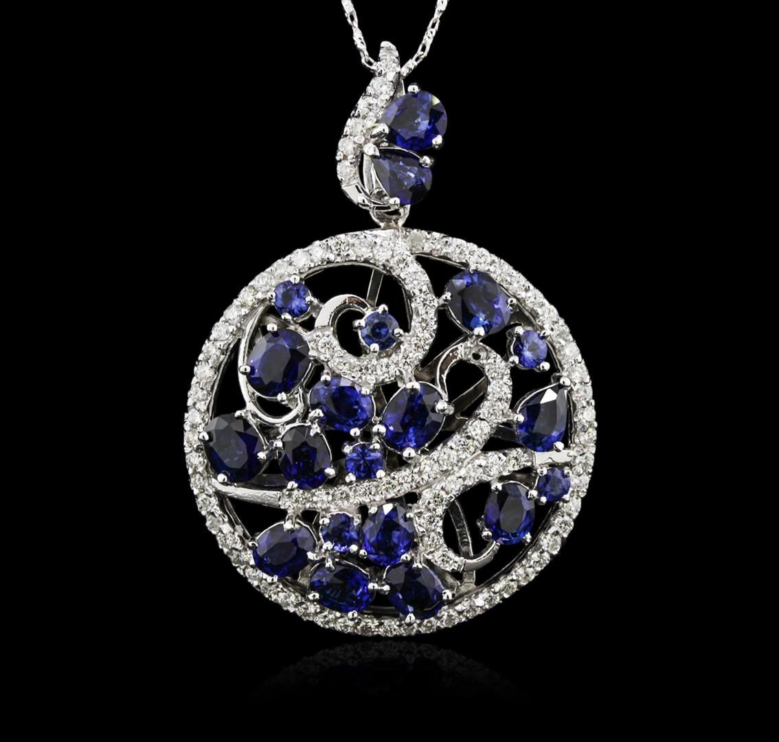 One electronically tested 14KT white gold ladies cast sapphire and diamond pendant & chain 18.0" long, with a lobster claw clasp with a bright polish finish. Identified with markings of "14K". Condition is new. Containing: Six prong set round modified brilliant cut natural blue sapphires, measuring 3.00 - 3.00 x 1.95 mm, approximate total weight of 0.84ct., clarity is eye clean, type II, medium, moderately strong, blue color, (GIA B 5/4), cut is good. Three prong set pear modified brilliant cut natural blue sapphires, measuring 5.30 x 3.00 x 1.95mm, approximate total weight of 0.75ct., clarity is eye clean, type II, medium, moderately strong, blue color, (GIA B 5/4), cut is good. Eleven prong set oval modified brilliant cut natural blue sapphires, measuring 5.70 x 5.00 x 3.25mm, approximate total weight of 8.58ct., clarity is eye clean, type II, medium, moderately strong, blue color, (GIA B 5/4), cut is good. Ninety-Four prong set round brilliant cut diamonds, measuring 1.20 - 1.50 x 0.81mm (depth est.) approximate total weight of 94 Stones = 0.85ct. Clarity: SI-1 to SI-2. Color: I - J, Cut is Good. Colored gemstones are presumed to have been subjected to commonly used enhancement processes. All diamonds and colored gemstones are graded in the mounting, unless otherwise stated. Total Weight of Colored Stones 10.17ct. Total Weight of Diamonds 0.85ct. Total Weight of Pendant & Chain 17.90 grams. GGL Appraised at $8,285.00.