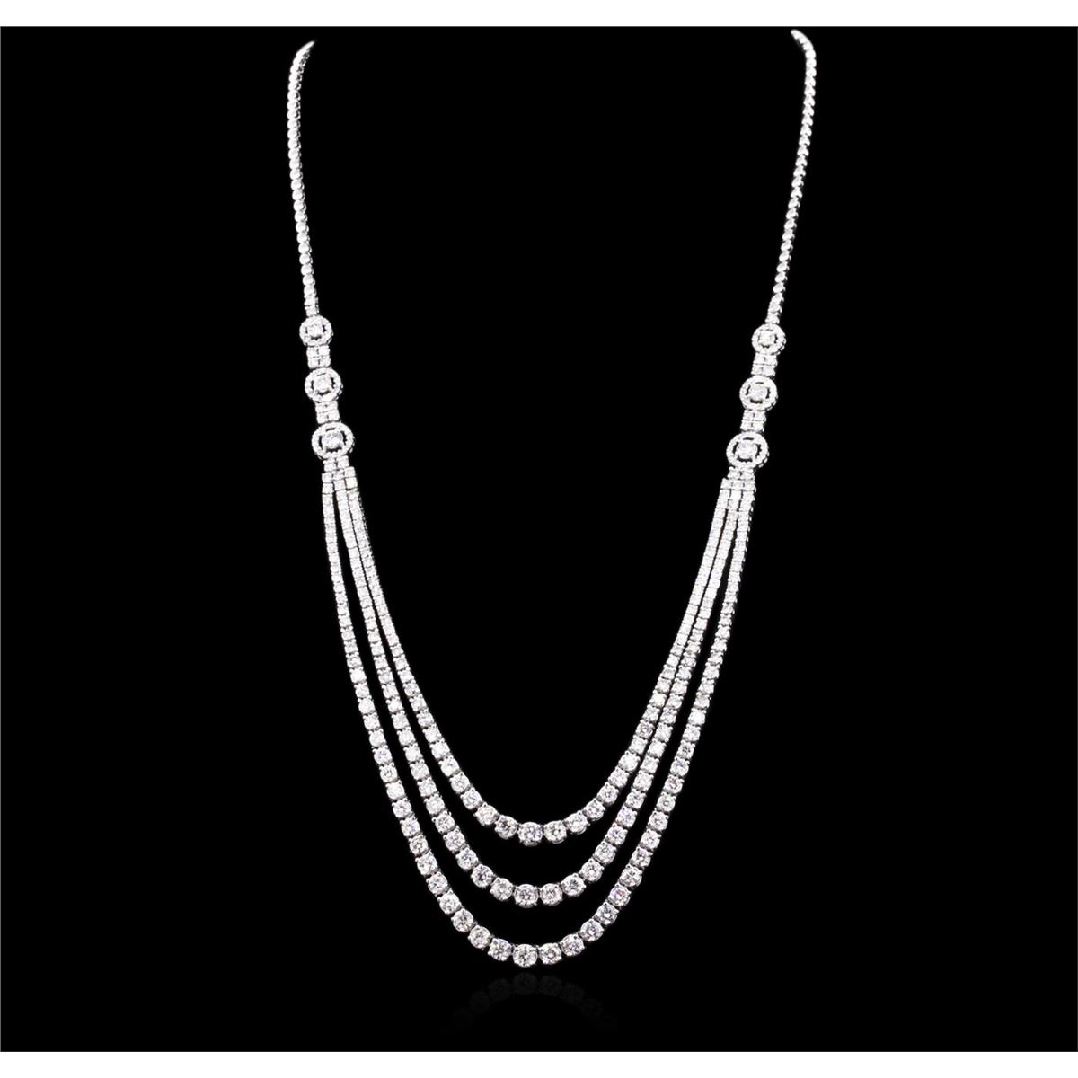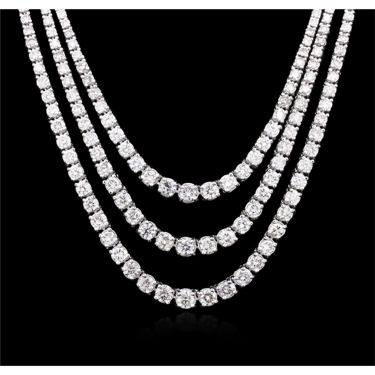 One electronically tested 14KT white gold ladies cast diamond necklace with a hidden box clasp with safety closer with a bright polish finish. Measurements: 17" in length Identified with markings of "14K". Condition is new. Containing: Six prong set round brilliant cut diamonds, measuring 3.50 - 2.50 x 1.80mm (depth est.) approximate total weight of 6 Stones = 0.59ct. Clarity: SI-1 to I-1. Color: I - J, Cut is Good. Forty-Six prong set round brilliant cut diamonds, measuring 3.50 - 2.20 x 1.71mm (depth est.) approximate total weight of 46 Stones = 3.90ct. Clarity: SI-2 to I-1. Color: I - J, Cut is Good. Two Hundred Seventy-One prong set round brilliant cut diamonds, measuring 1.80 - 1.80 x 1.08mm (depth est.) approximate total weight of 271 Stones = 5.77ct. Clarity: SI-1 to I-1. Color: I - J, Cut is Good. All diamonds are graded in the mounting, unless otherwise stated. Total Weight of Diamonds 10.26ct. Total Weight of Necklace 28.80 grams. GGL Appraised at $30,520.00.