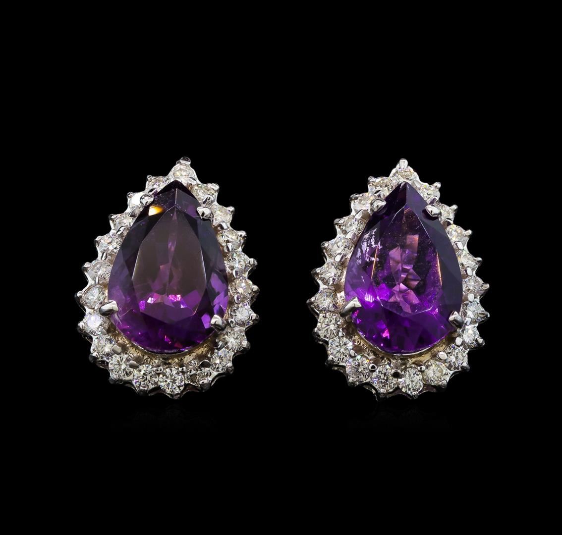 One pair electronically tested 14KT white gold ladies cast amethyst and diamond earrings with friction posts with a bright polish finish. Identified with markings of "585". Condition is new. Containing: Two prong set pear modified brilliant cut natural amethysts, measuring 15.00 x 10.00 x 6.50mm, approximate total weight of 10.38ct., clarity is eye clean, type II, medium, moderately strong, purple color, (GIA P 5/4), cut is good. Forty-Four prong set round brilliant cut diamonds, measuring 2.00 - 2.00 x 1.20mm (depth est.) approximate total weight of 44 Stones = 1.29ct. Clarity: SI-2 to I-1. Color: I - J, Cut is Good. Total Weight of Colored Stones 10.38ct. Total Weight of Diamonds 1.29ct. Total Weight of Earrings 9.40 grams. GGL Appraised at $2,340.00.