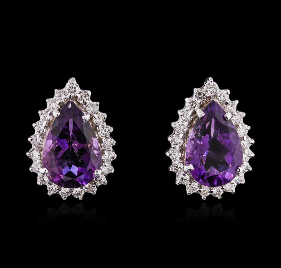 One pair electronically tested 14KT white gold ladies cast amethyst and diamond earrings with friction posts with a bright polish finish. Identified with markings of "585". Condition is new. Containing: Two prong set pear modified brilliant cut natural amethysts, measuring 15.00 x 10.00 x 6.50mm, approximate total weight of 10.38ct., clarity is eye clean, type II, medium, moderately strong, purple color, (GIA P 5/4), cut is good. Forty-Four prong set round brilliant cut diamonds, measuring 2.00 - 2.00 x 1.20mm (depth est.) approximate total weight of 44 Stones = 1.29ct. Clarity: SI-2 to I-1. Color: I - J, Cut is Good. Total Weight of Colored Stones 10.38ct. Total Weight of Diamonds 1.29ct. Total Weight of Earrings 9.40 grams. GGL Appraised at $2,340.00.