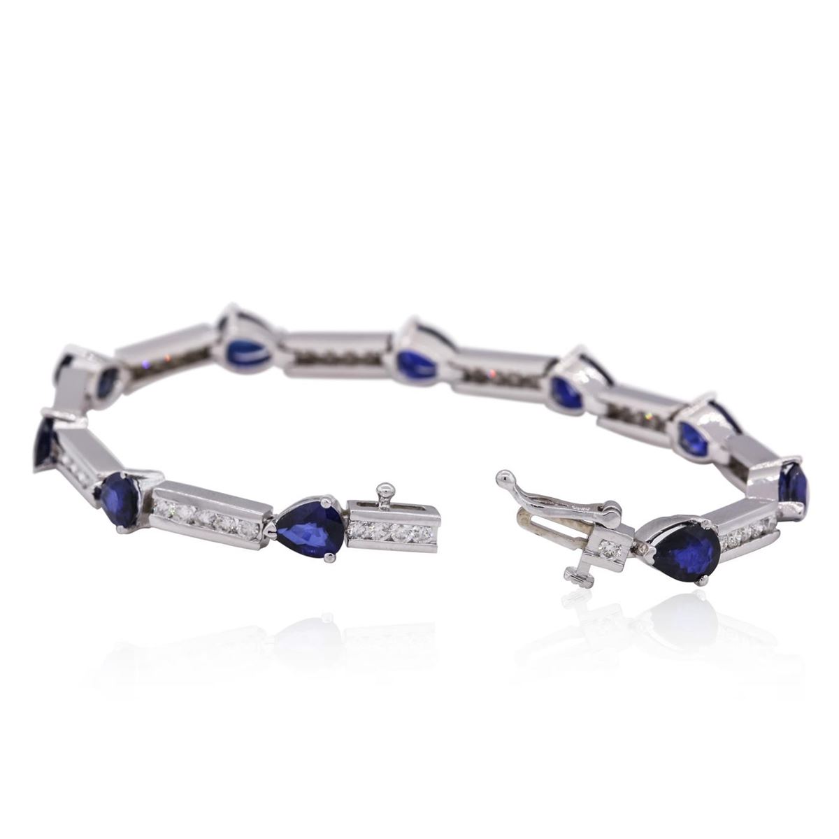 One electronically tested 14KT white gold ladies combination cast & assembled sapphire and diamond bracelet with a hidden box clasp with safety closer with a bright polish finish. Measurements: 7 in length. Identified with markings of 14K. Condition is new. Containing: Ten prong set pear modified brilliant cut natural blue sapphires, measuring 8.00 x 5.00 x 3.25mm, approximate total weight of 10.40ct., clarity is eye clean, type II, medium, moderately strong, blue color, (GIA B 5/4), cut is good. Fifty channel set round brilliant cut diamonds, measuring 2.00 - 2.00 x 1.20mm (depth est.) approximate total weight of 50 Stones = 1.46ct. Clarity: SI-1 to SI-2. Color: I - J, Cut is Good. Colored gemstones are presumed to have been subjected to commonly used enhancement processes. All diamonds and colored gemstones are graded in the mounting, unless otherwise stated. Total Weight of Colored Stones 10.40ct. Total Weight of Diamonds 1.46ct. Total Weight of Bracelet 16.60 grams. GGL Appraised at $10,800.00.