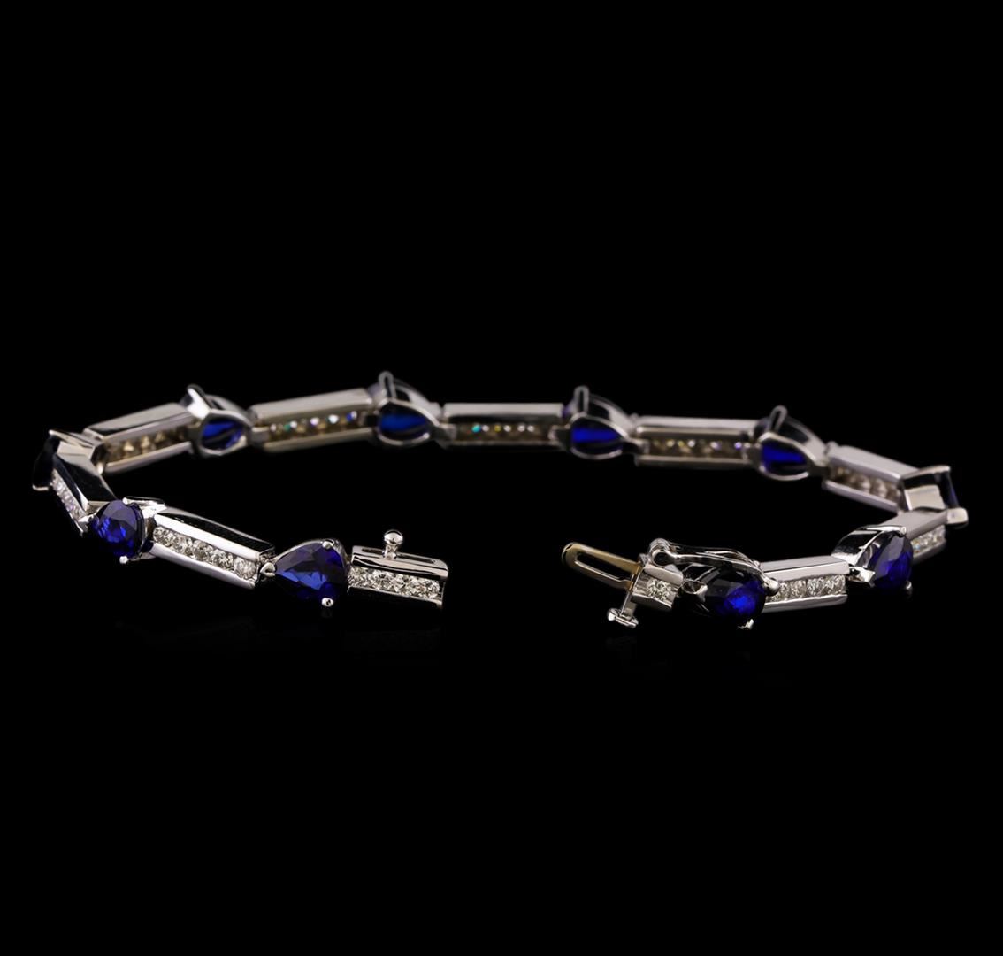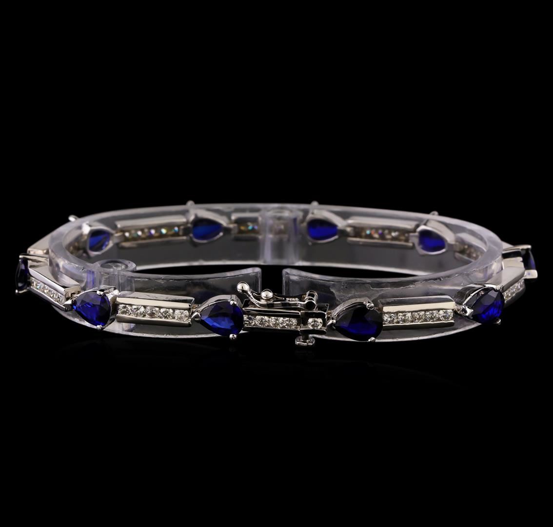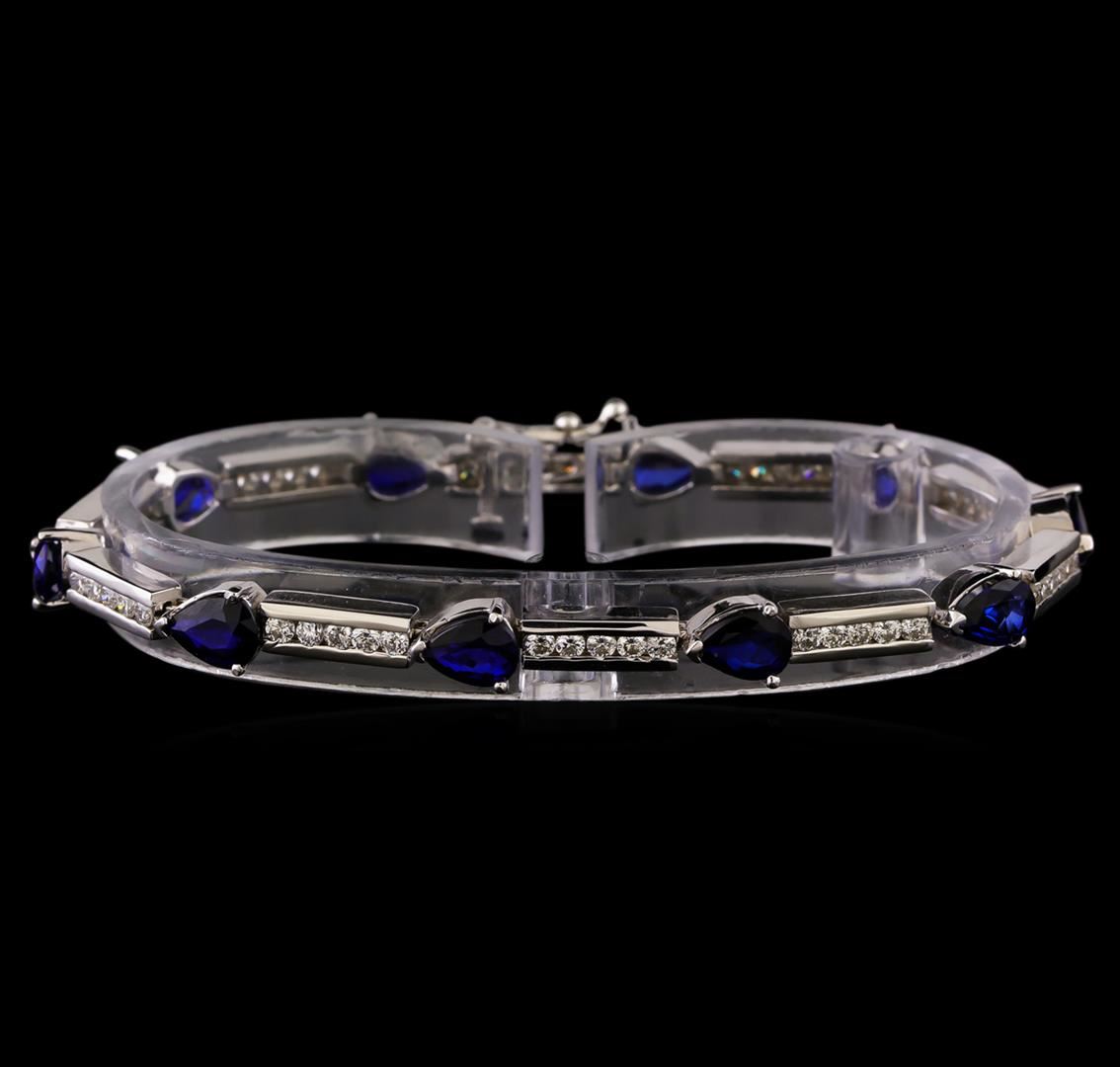 One electronically tested 14KT white gold ladies combination cast & assembled sapphire and diamond bracelet with a hidden box clasp with safety closer with a bright polish finish. Measurements: 7 in length. Identified with markings of 14K. Condition is new. Containing: Ten prong set pear modified brilliant cut natural blue sapphires, measuring 8.00 x 5.00 x 3.25mm, approximate total weight of 10.40ct., clarity is eye clean, type II, medium, moderately strong, blue color, (GIA B 5/4), cut is good. Fifty channel set round brilliant cut diamonds, measuring 2.00 - 2.00 x 1.20mm (depth est.) approximate total weight of 50 Stones = 1.46ct. Clarity: SI-1 to SI-2. Color: I - J, Cut is Good. Colored gemstones are presumed to have been subjected to commonly used enhancement processes. All diamonds and colored gemstones are graded in the mounting, unless otherwise stated. Total Weight of Colored Stones 10.40ct. Total Weight of Diamonds 1.46ct. Total Weight of Bracelet 16.60 grams. GGL Appraised at $10,800.00.