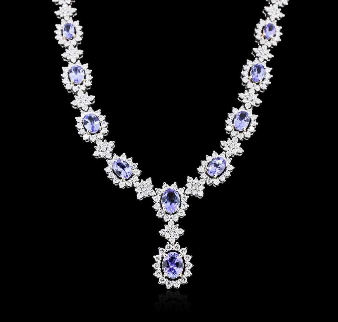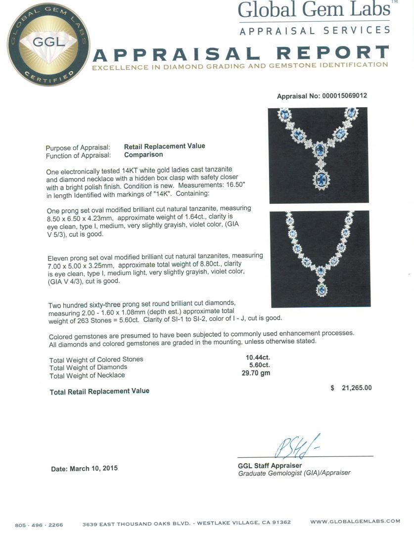 One electronically tested 14KT white gold ladies cast tanzanite and diamond necklace with a hidden box clasp with safety closer with a bright polish finish. Measurements: 16.50" in length Identified with markings of "14K". Condition is new. Containing: One prong set oval modified brilliant cut natural tanzanite, measuring 8.50 x 6.50 x 4.23mm, approximate weight of 1.64ct., clarity is eye clean, type I, medium, very slightly grayish, violet color, (GIA V 5/3), cut is good. Eleven prong set oval modified brilliant cut natural tanzanites, measuring 7.00 x 5.00 x 3.25mm, approximate total weight of 8.80ct., clarity is eye clean, type I, medium light, very slightly grayish, violet color, (GIA V 4/3), cut is good. Two Hundred Sixty-Three prong set round brilliant cut diamonds, measuring 2.00 - 1.60 x 1.08mm (depth est.) approximate total weight of 263 Stones = 5.60ct. Clarity: SI-1 to SI-2. Color: I - J, Cut is Good. Colored gemstones are presumed to have been subjected to commonly used enhancement processes. All diamonds and colored gemstones are graded in the mounting, unless otherwise stated. Total Weight of Colored Stones 10.44ct. Total Weight of Diamonds 5.60ct. Total Weight of Necklace 29.70 grams. GGL Appraised at $21,265.00.