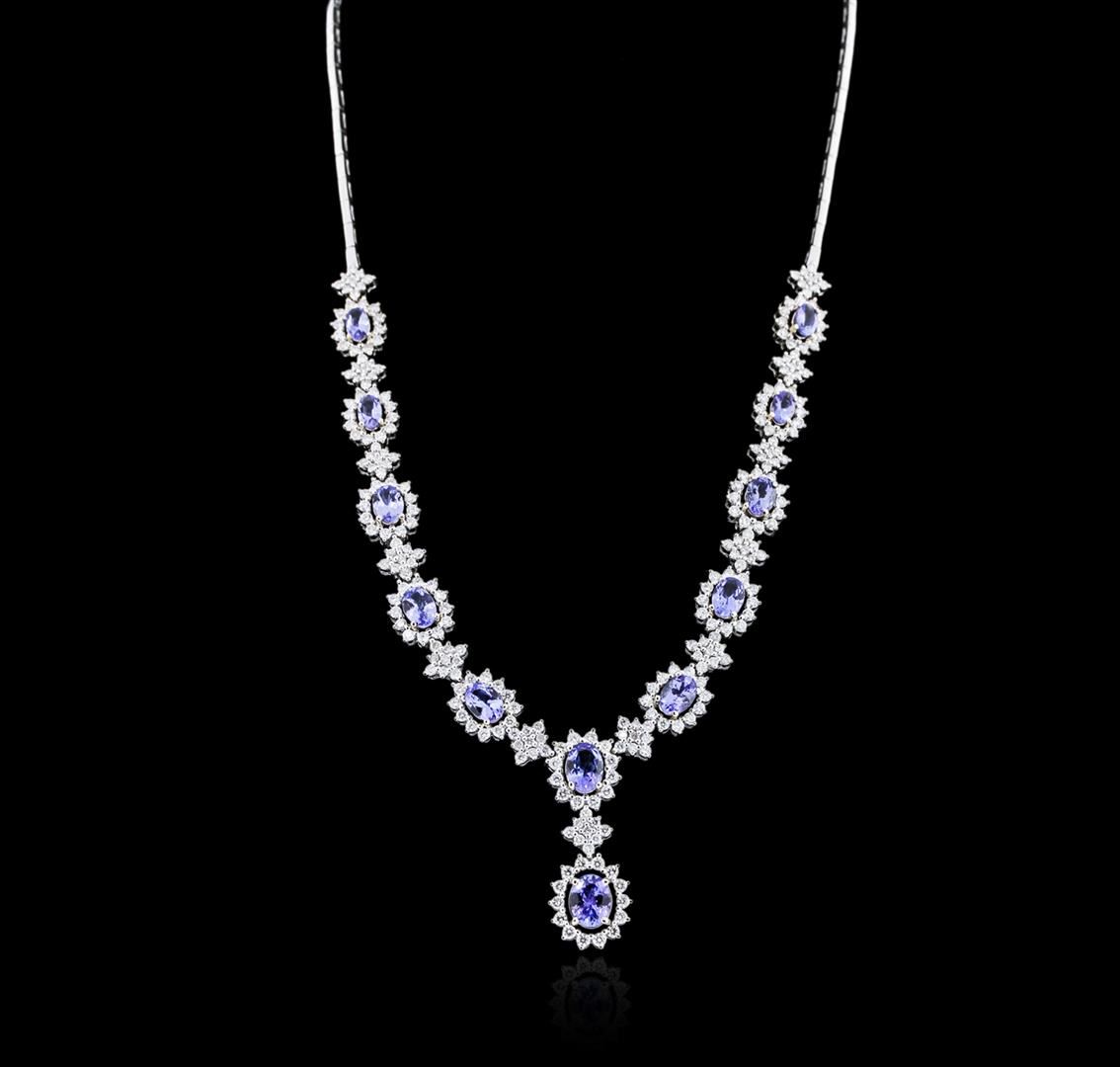 One electronically tested 14KT white gold ladies cast tanzanite and diamond necklace with a hidden box clasp with safety closer with a bright polish finish. Measurements: 16.50" in length Identified with markings of "14K". Condition is new. Containing: One prong set oval modified brilliant cut natural tanzanite, measuring 8.50 x 6.50 x 4.23mm, approximate weight of 1.64ct., clarity is eye clean, type I, medium, very slightly grayish, violet color, (GIA V 5/3), cut is good. Eleven prong set oval modified brilliant cut natural tanzanites, measuring 7.00 x 5.00 x 3.25mm, approximate total weight of 8.80ct., clarity is eye clean, type I, medium light, very slightly grayish, violet color, (GIA V 4/3), cut is good. Two Hundred Sixty-Three prong set round brilliant cut diamonds, measuring 2.00 - 1.60 x 1.08mm (depth est.) approximate total weight of 263 Stones = 5.60ct. Clarity: SI-1 to SI-2. Color: I - J, Cut is Good. Colored gemstones are presumed to have been subjected to commonly used enhancement processes. All diamonds and colored gemstones are graded in the mounting, unless otherwise stated. Total Weight of Colored Stones 10.44ct. Total Weight of Diamonds 5.60ct. Total Weight of Necklace 29.70 grams. GGL Appraised at $21,265.00.