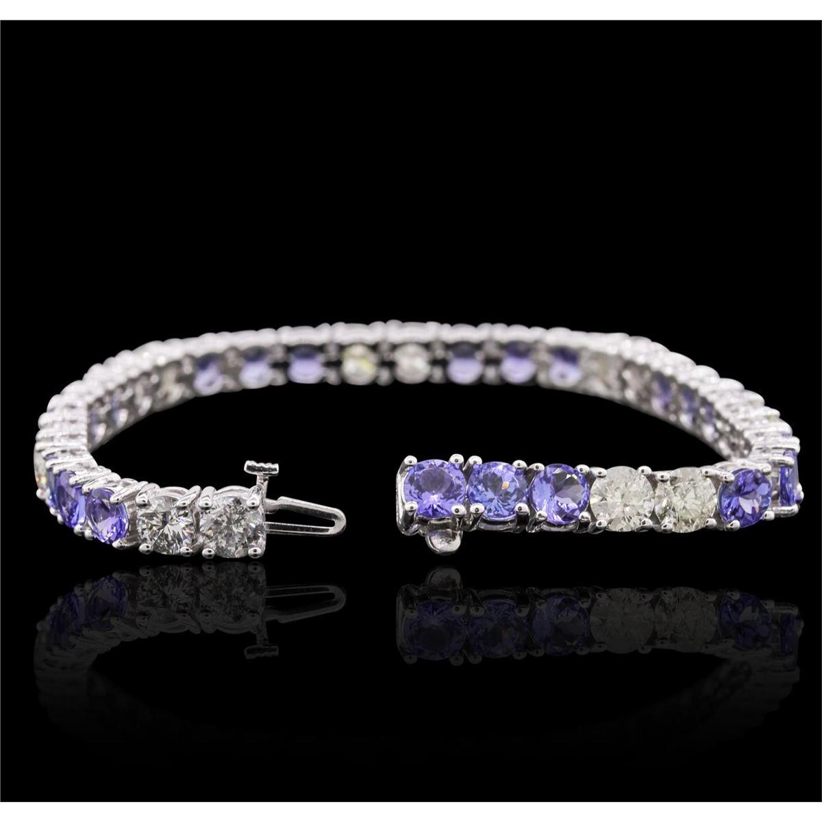 One electronically tested 14KT white gold ladies cast & assembled tanzanite and diamond bracelet with a bright polish finish. Condition is new, good workmanship. Seven inch length bracelet features a tanzanite and diamond ribbon, terminating in a hidden clasp with safety bar. Identified with markings of "14K". Containing: Twenty-one prong set round brilliant cut natural tanzanites, measuring 5.00 - 4.90 x 2.80 mm, 6%. bulge factor, approximate. Total Weight of 10.50ct., clarity is eye clean, type I, medium dark, moderately strong, bluish violet color, (GIA bV 6/4), cut is good. Transmitting light with no distortion, transparent. Color grade is an average for the group. Graded in the setting. Tanzanite is a very rare gemstone that is only found in the country of Tanzania. Originally discovered in 1967. Tiffany & Company, named the stone Tanzanite. It is found in the Usumburu Mountains that border the Umba Valley of northern Tanzania. Tanzanite occurs in gray, brown, violet, blue, reddish-purple, & green. The gem is interesting because of its exceptional pleochroism. Rotated in different directions a tanzanite will exhibit multiple changes of color. Tanzanite has a low tolerance to ultrasonic cleaning, and should not be cleaned using this method. Fourteen prong set round brilliant cut diamonds, measuring 5.10 - 5.00 x 3.25mm (depth est.) approximate. Total Weight of 14 Stones = 7.17ct. The color grade reflects the entire range of color for this group. Graded in the setting. Clarity: I-1 to I-2 . Color: I - L. Total Weight of Colored Stones 10.50ct.. Total Weight of Diamonds 7.17ct.. Total Weight of Bracelet 20.28gm. AIG Appraised at $45,345.00.