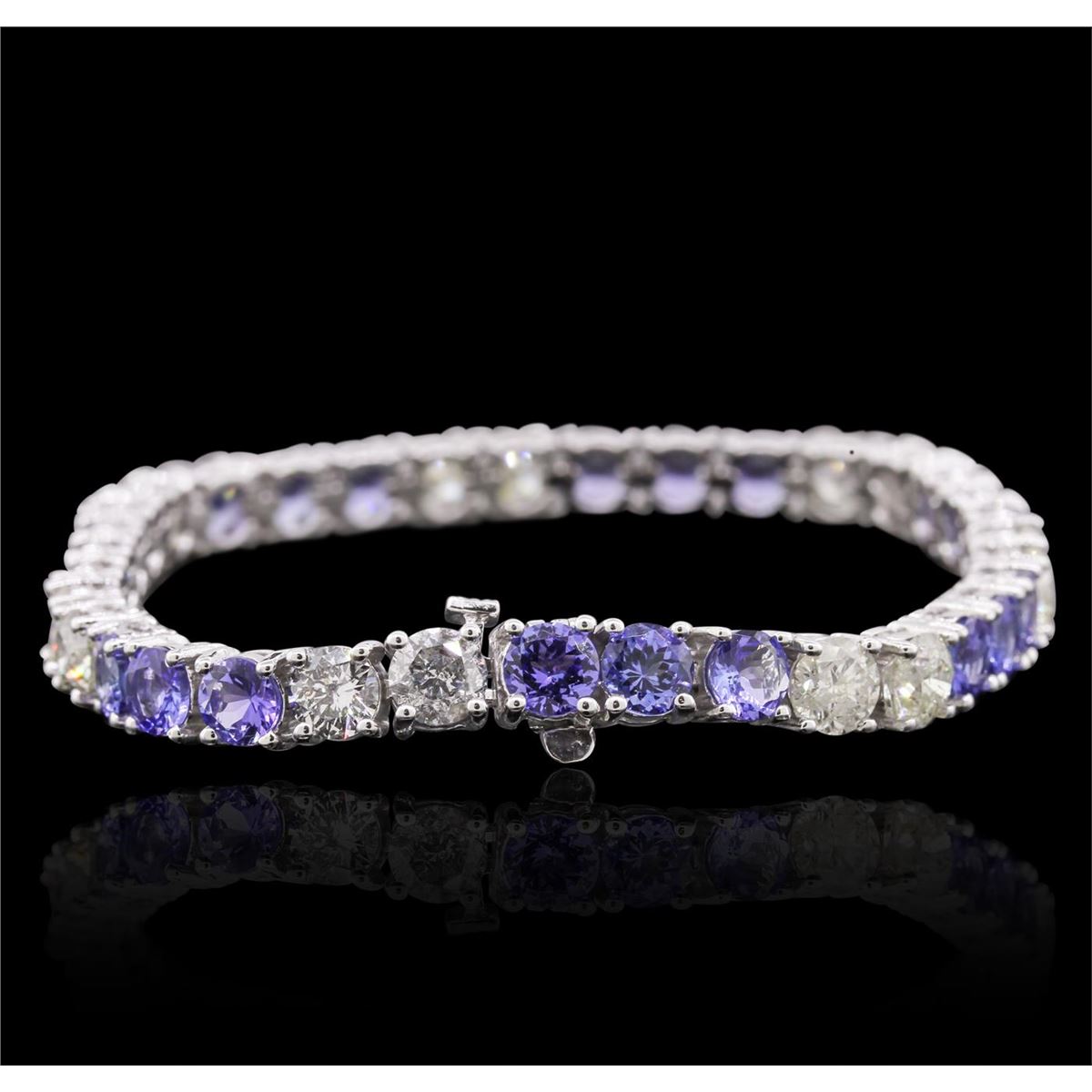 One electronically tested 14KT white gold ladies cast & assembled tanzanite and diamond bracelet with a bright polish finish. Condition is new, good workmanship. Seven inch length bracelet features a tanzanite and diamond ribbon, terminating in a hidden clasp with safety bar. Identified with markings of "14K". Containing: Twenty-one prong set round brilliant cut natural tanzanites, measuring 5.00 - 4.90 x 2.80 mm, 6%. bulge factor, approximate. Total Weight of 10.50ct., clarity is eye clean, type I, medium dark, moderately strong, bluish violet color, (GIA bV 6/4), cut is good. Transmitting light with no distortion, transparent. Color grade is an average for the group. Graded in the setting. Tanzanite is a very rare gemstone that is only found in the country of Tanzania. Originally discovered in 1967. Tiffany & Company, named the stone Tanzanite. It is found in the Usumburu Mountains that border the Umba Valley of northern Tanzania. Tanzanite occurs in gray, brown, violet, blue, reddish-purple, & green. The gem is interesting because of its exceptional pleochroism. Rotated in different directions a tanzanite will exhibit multiple changes of color. Tanzanite has a low tolerance to ultrasonic cleaning, and should not be cleaned using this method. Fourteen prong set round brilliant cut diamonds, measuring 5.10 - 5.00 x 3.25mm (depth est.) approximate. Total Weight of 14 Stones = 7.17ct. The color grade reflects the entire range of color for this group. Graded in the setting. Clarity: I-1 to I-2 . Color: I - L. Total Weight of Colored Stones 10.50ct.. Total Weight of Diamonds 7.17ct.. Total Weight of Bracelet 20.28gm. AIG Appraised at $45,345.00.