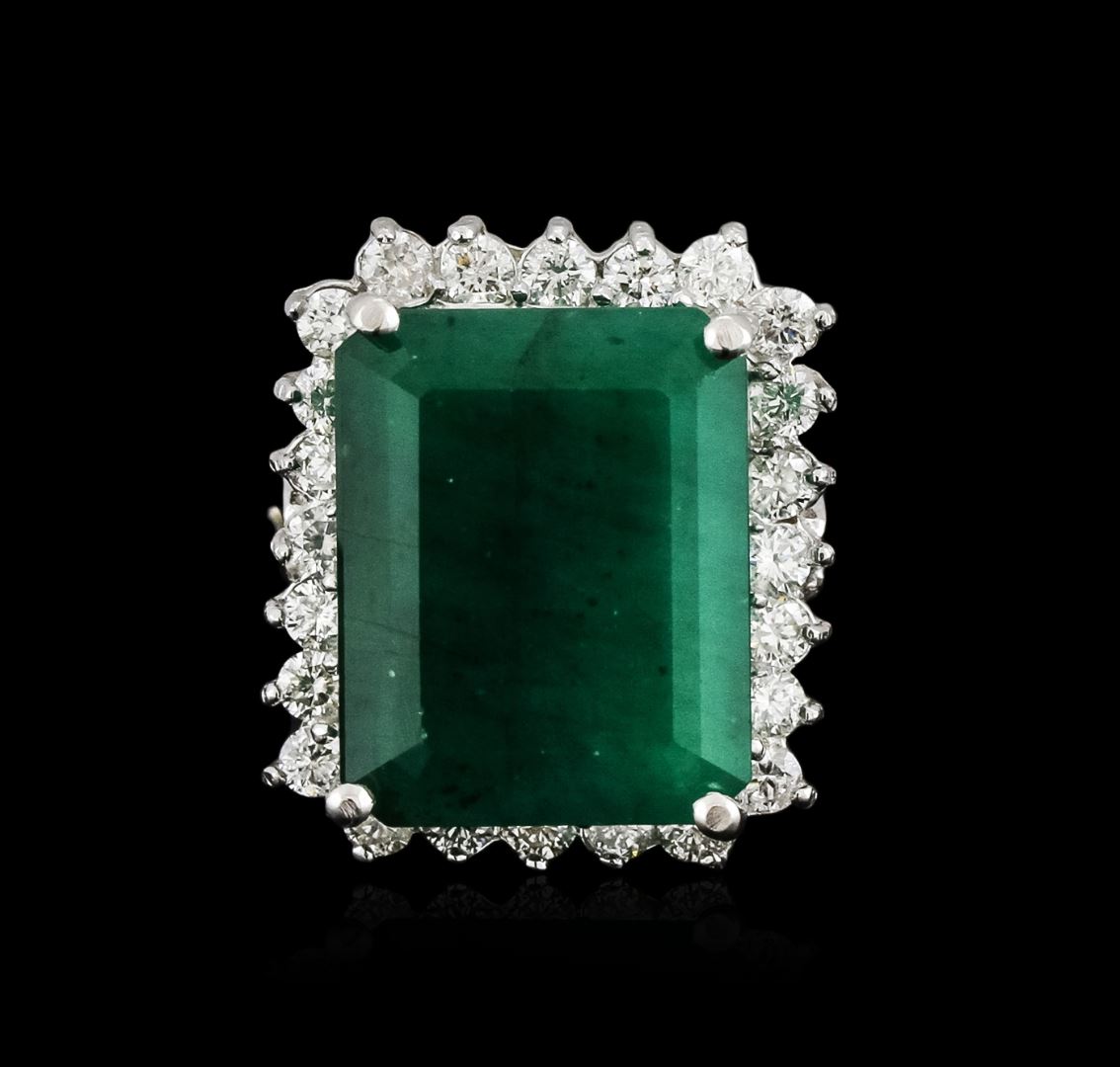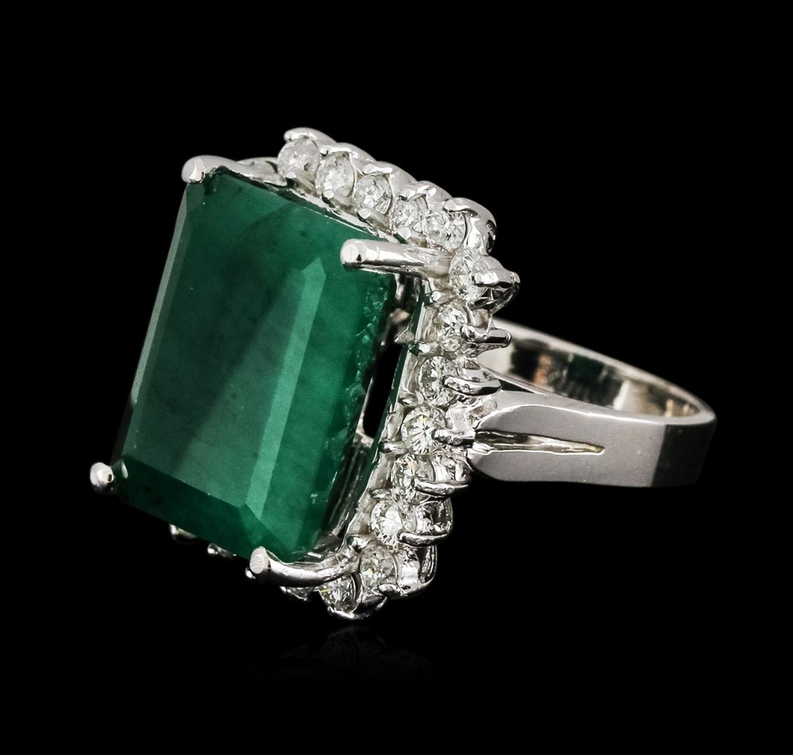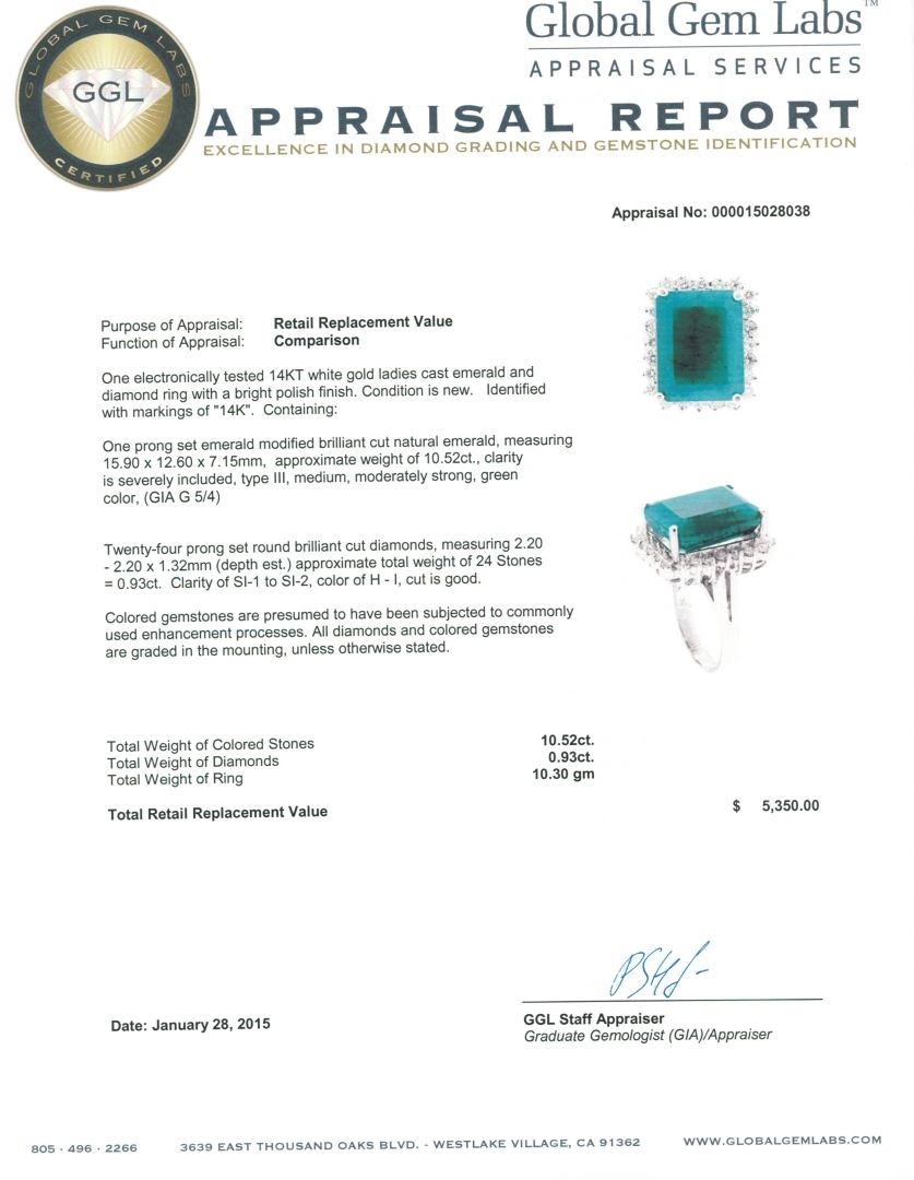 One electronically tested 14KT white gold ladies cast emerald and diamond ring with a bright polish finish. Identified with markings of "14K". Condition is new. Containing: One prong set emerald modified brilliant cut natural emerald, measuring 15.90 x 12.60 x 7.15mm, approximate weight of 10.52ct., clarity is severely included, type III, medium, moderately strong, green color, (GIA G 5/4)Twenty-Four prong set round brilliant cut diamonds, measuring 2.20 - 2.20 x 1.32mm (depth est.) approximate total weight of 24 Stones = 0.93ct. Clarity: SI-1 to SI-2. Color: H - I, Cut is Good. Colored gemstones are presumed to have been subjected to commonly used enhancement processes. All diamonds and colored gemstones are graded in the mounting, unless otherwise stated. Total Weight of Colored Stones 10.52ct. Total Weight of Diamonds 0.93ct. Total Weight of Ring 10.30 grams. GGL Appraised at $5,350.00.