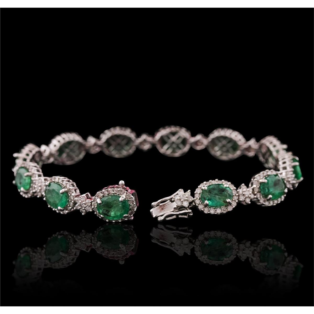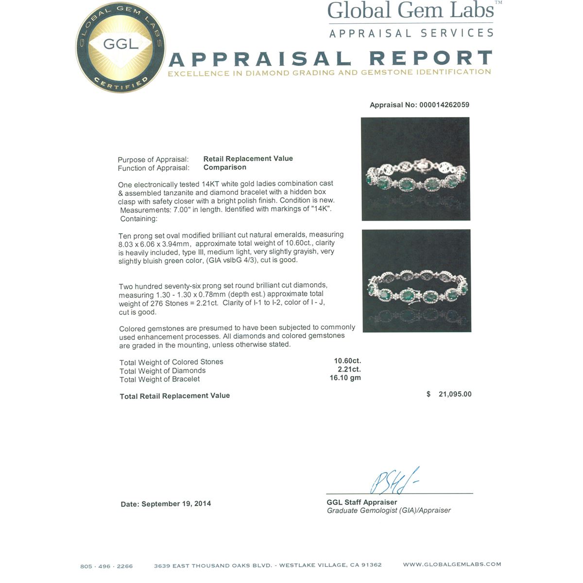 One electronically tested 14KT white gold ladies combination cast & assembled tanzanite and diamond bracelet with a hidden box clasp with safety closer with a bright polish finish. Measurements: 7.00." in length. Identified with markings of "14K". Condition is new. Containing: Ten prong set oval modified brilliant cut natural emeralds, measuring 8.03 x 6.06 x 3.94mm, approximate total weight of 10.60ct., clarity is heavily included, type III, medium light, very slightly grayish, very slightly bluish green color, (GIA vslbG 4/3), cut is good. Two Hundred Seventy-Six prong set round brilliant cut diamonds, measuring 1.30 - 1.30 x 0.78mm (depth est.) approximate total weight of 276 Stones = 2.21ct. Clarity: I-1 to I-2. Color: I - J, Cut is Good. Colored gemstones are presumed to have been subjected to commonly used enhancement processes. All diamonds and colored gemstones are graded in the mounting, unless otherwise stated. Total Weight of Colored Stones 10.60ct. Total Weight of Diamonds 2.21ct. Total Weight of Bracelet 16.10 grams. GGL Appraised at $21,095.00.
