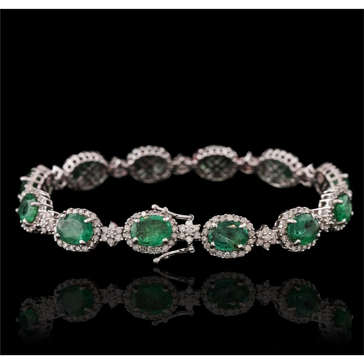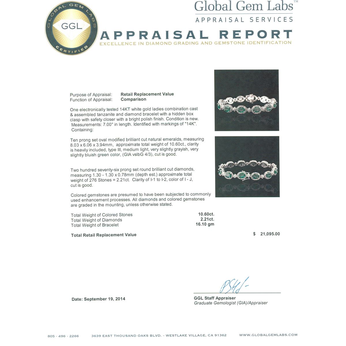 One electronically tested 14KT white gold ladies combination cast & assembled tanzanite and diamond bracelet with a hidden box clasp with safety closer with a bright polish finish. Measurements: 7.00." in length. Identified with markings of "14K". Condition is new. Containing: Ten prong set oval modified brilliant cut natural emeralds, measuring 8.03 x 6.06 x 3.94mm, approximate total weight of 10.60ct., clarity is heavily included, type III, medium light, very slightly grayish, very slightly bluish green color, (GIA vslbG 4/3), cut is good. Two Hundred Seventy-Six prong set round brilliant cut diamonds, measuring 1.30 - 1.30 x 0.78mm (depth est.) approximate total weight of 276 Stones = 2.21ct. Clarity: I-1 to I-2. Color: I - J, Cut is Good. Colored gemstones are presumed to have been subjected to commonly used enhancement processes. All diamonds and colored gemstones are graded in the mounting, unless otherwise stated. Total Weight of Colored Stones 10.60ct. Total Weight of Diamonds 2.21ct. Total Weight of Bracelet 16.10 grams. GGL Appraised at $21,095.00.