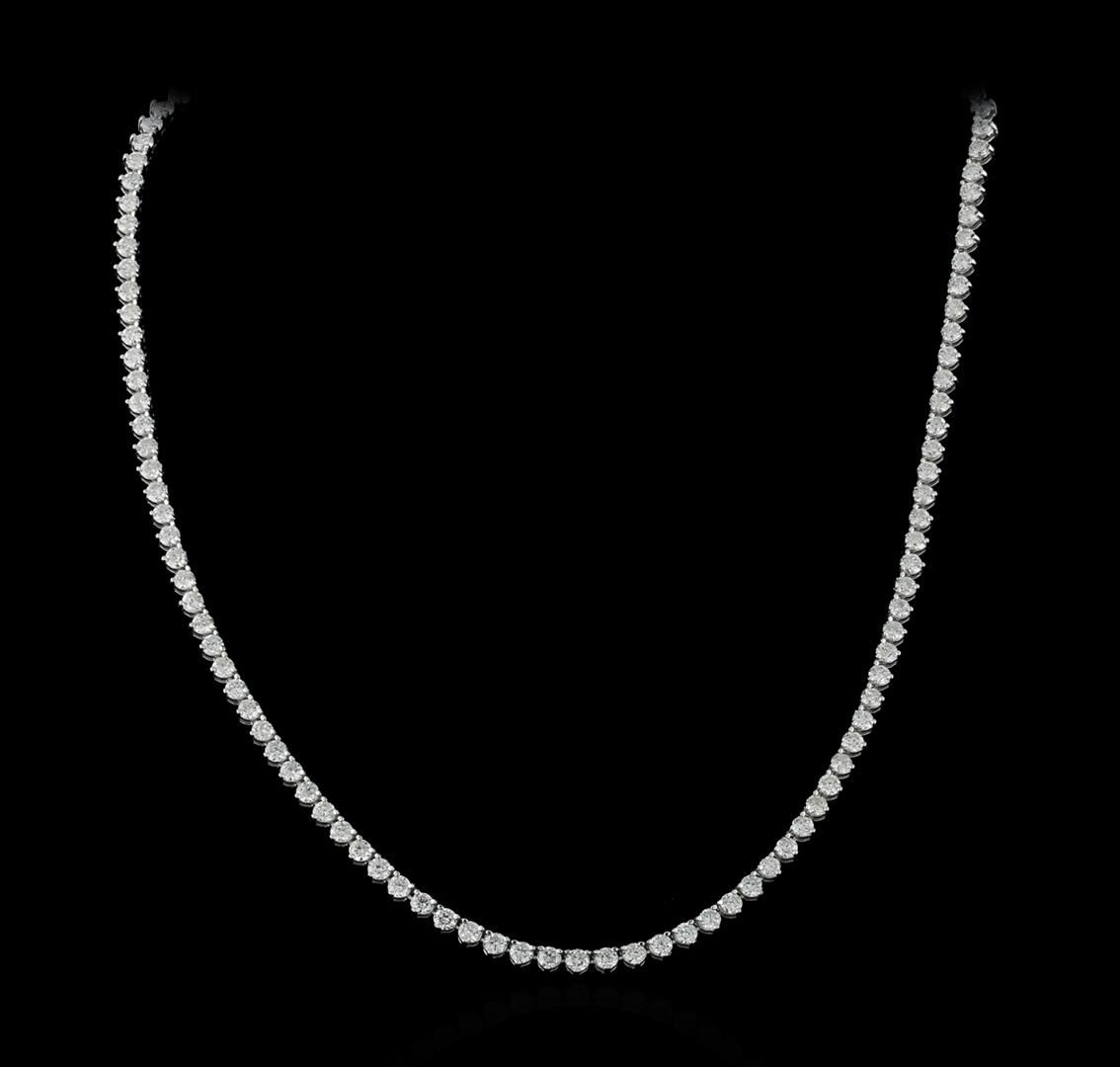 One electronically tested 14KT white gold ladies cast diamond necklace with a hidden box clasp with a bright polish finish. Measurements: 16.50" in length Identified with markings of "14K". Condition is new. Containing: One Hundred Twenty prong set round brilliant cut diamonds, measuring 2.90 - 2.90 x 1.74mm (depth est.) approximate total weight of 120 Stones = 10.62ct. Clarity: SI-2 to I-1. Color: H - I, Cut is Good. All diamonds are graded in the mounting, unless otherwise stated. Total Weight of Diamonds 10.62ct. Total Weight of Necklace 17.20 grams. GGL Appraised at $22,940.00.