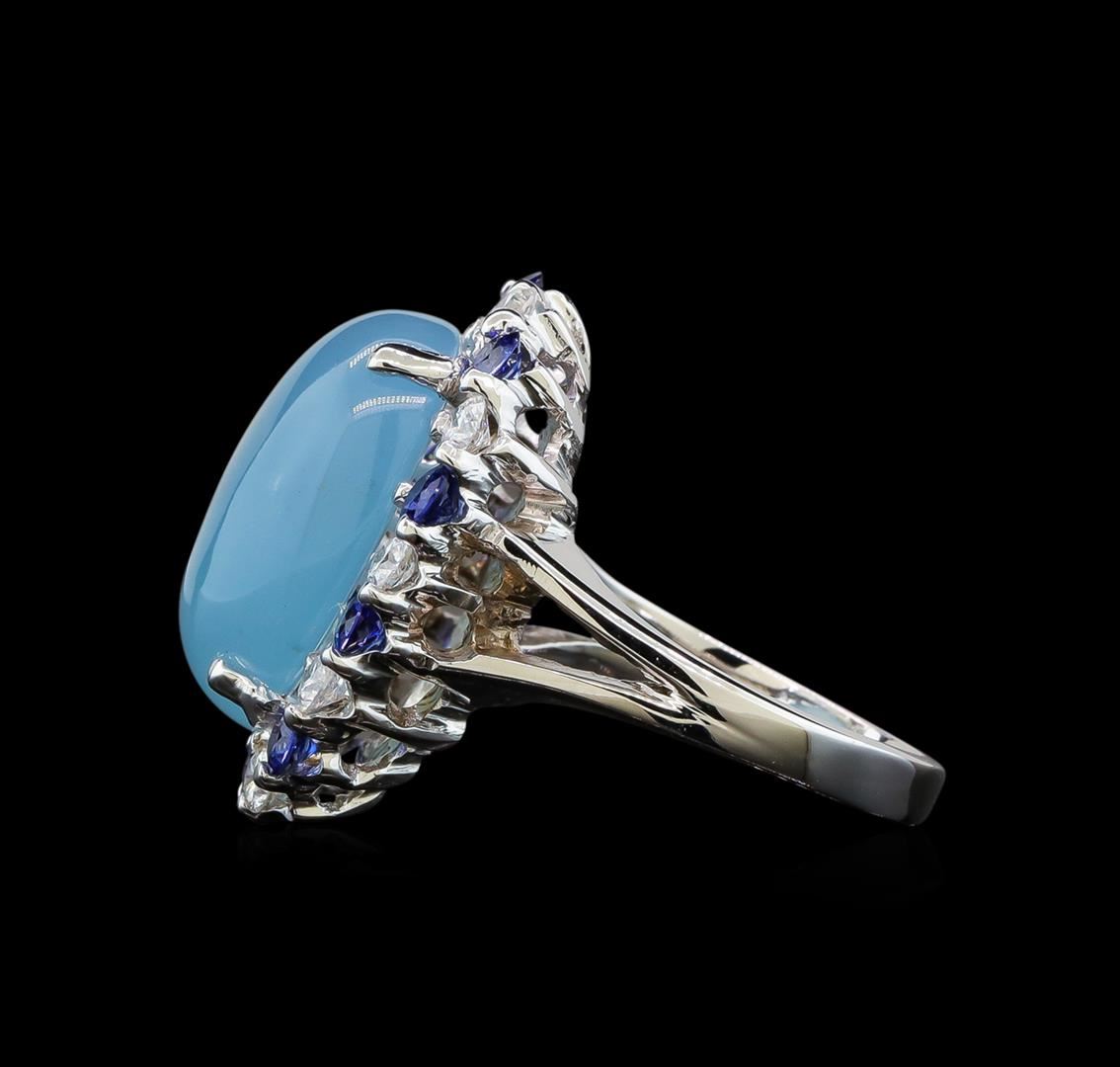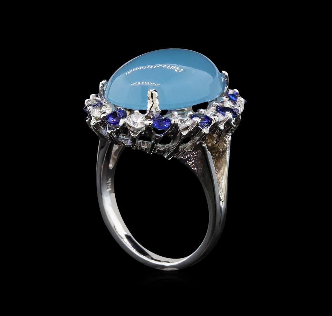 One electronically tested 14KT white gold ladies cast aquamarine, sapphire and diamond ring with a bright polish finish. Identified with markings of "14K". Condition is new. Containing: One prong set oval cabochon cut natural aquamarine, measuring 17.50 x 12.00. x 7.80mm, approximate weight of 10.73ct., clarity is heavily included, type I, medium light, very slightly grayish, blue color, (GIA B 4/3), cut is good. Ten prong set round modified brilliant cut natural blue sapphires, measuring 2.80 - 2.80 x 1.82 mm, approximate total weight of 1.10ct., clarity is eye clean, type II, medium, moderately strong, blue color, (GIA B 5/4), cut is good. Ten prong set round brilliant cut diamonds, measuring 2.80 - 2.50 x 1.59mm (depth est.) approximate total weight of 10 Stones = 1.02ct. Clarity: SI-1 to I-1. Color: I - J, Cut is Good. Colored gemstones are presumed to have been subjected to commonly used enhancement processes. All diamonds and colored gemstones are graded in the mounting, unless otherwise stated. Total Weight of Colored Stones 11.83ct. Total Weight of Diamonds 1.02ct. Total Weight of Ring 9.50 grams. GGL Appraised at $4,440.00.