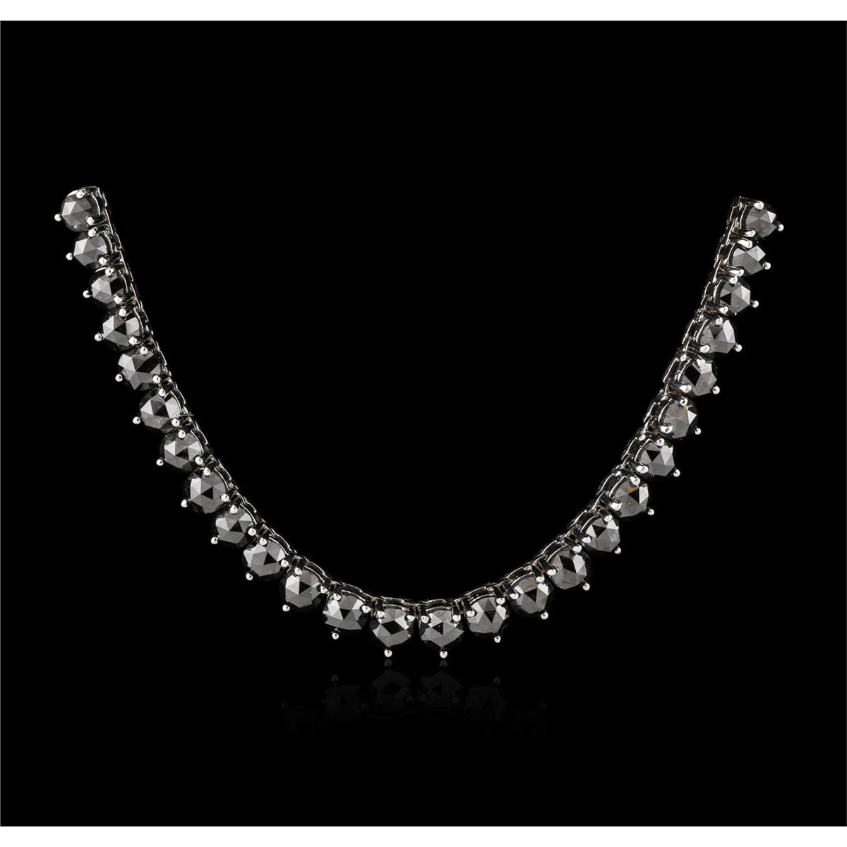 One electronically tested 14KT white gold ladies cast diamond necklace with a hidden box clasp with safety closer with a bright polish finish. Measurements: 18" in length Identified with markings of "14K". Condition is very good. Containing: Forty prong set rose cut diamonds, measuring 6.00. - 4.00. x 2.50mm (depth est.) approximate total weight of 40 Stones = 10.75ct. Color of the diamonds have been treated. All diamonds are graded in the mounting, unless otherwise stated. Total Weight of Diamonds 10.75ct. Total Weight of Necklace 42.90 grams. GGL Appraised at $12,030.00.