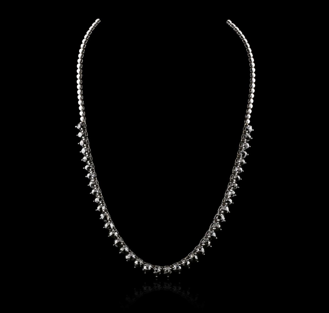 One electronically tested 14KT white gold ladies cast diamond necklace with a hidden box clasp with safety closer with a bright polish finish. Measurements: 18" in length Identified with markings of "14K". Condition is very good. Containing: Forty prong set rose cut diamonds, measuring 6.00. - 4.00. x 2.50mm (depth est.) approximate total weight of 40 Stones = 10.75ct. Color of the diamonds have been treated. All diamonds are graded in the mounting, unless otherwise stated. Total Weight of Diamonds 10.75ct. Total Weight of Necklace 42.90 grams. GGL Appraised at $12,030.00.