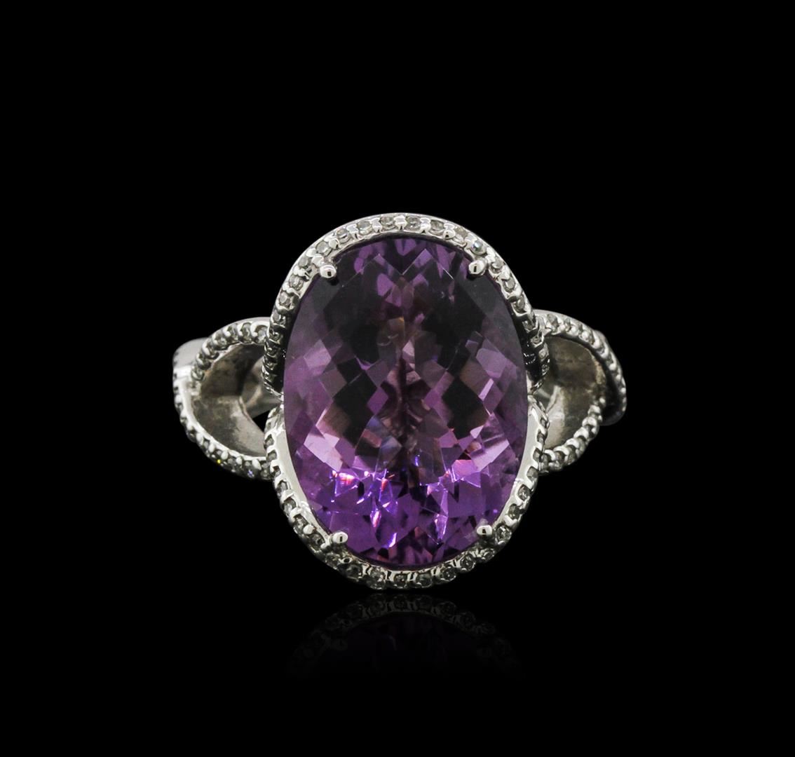 One electronically tested 14KT white gold ladies cast amethyst and diamond ring with a bright polish finish. Trademark is EFFY. Identified with markings of "14K". Condition is new. Containing: One prong set oval modified mixed cut natural amethyst, measuring 16.04 x 12.04 x 10.01mm, approximate weight of 10.80ct., clarity is eye clean, type II, medium, moderately strong, purple color, (GIA P 5/4), cut is good. One Hundred Thirty-Eight prong set single cut diamonds, measuring 1.00 - 1.00 x 0.60mm (depth est.) approximate total weight of 138 Stones = 0.50ct. Clarity of SI-2 to I-1, Color of J - K. All diamonds and colored gemstones are graded in the mounting, unless otherwise stated. Colored gemstones are presumed to have been subjected to commonly used enhancement processes. Total Weight of Colored Stones 10.80ct. Total Weight of Diamonds 0.50ct. Total Weight of Ring 11.10 grams. GGL Appraised at $2,975.00.