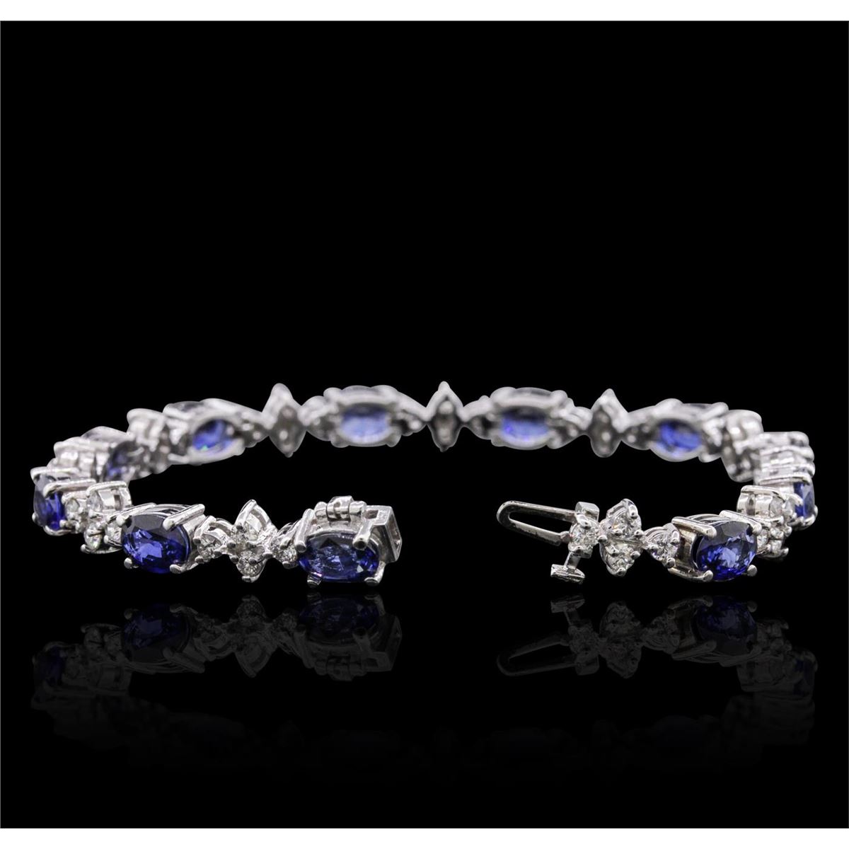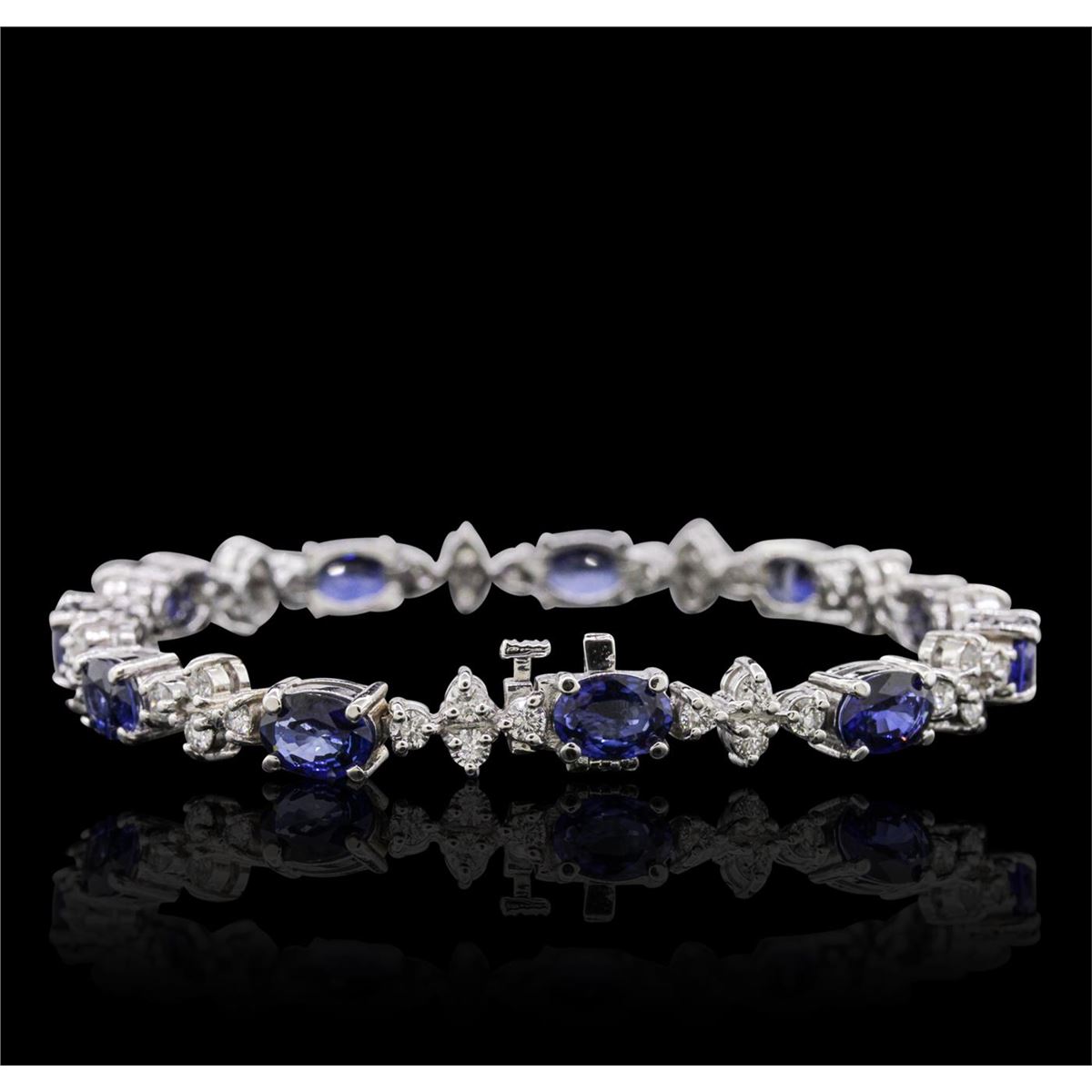 One electronically tested 14KT white gold ladies combination cast & assembled sapphire and diamond bracelet with a hidden box clasp with a bright polish finish. Measurements: 7" in length. Identified with markings of "14K". Condition is new. Containing: Eleven prong set oval modified brilliant cut natural blue sapphires, measuring 7.00 x 5.15 x 3.34mm, approximate total weight of 10.89ct., clarity is eye clean, type II, medium, moderately strong, blue color, (GIA B 5/4), cut is good. One Hundred prong set round brilliant cut diamonds, measuring 1.50 - 1.50 x 0.90mm (depth est.) approximate total weight of 100 Stones = 1.23ct. Clarity: SI-2 to I-2. Color: I - J, Cut is Good. Colored gemstones are presumed to have been subjected to commonly used enhancement processes. All diamonds and colored gemstones are graded in the mounting, unless otherwise stated. Total Weight of Colored Stones 10.89ct. Total Weight of Diamonds 1.23ct. Total Weight of Bracelet 16.40 grams. GGL Appraised at $13,285.00.