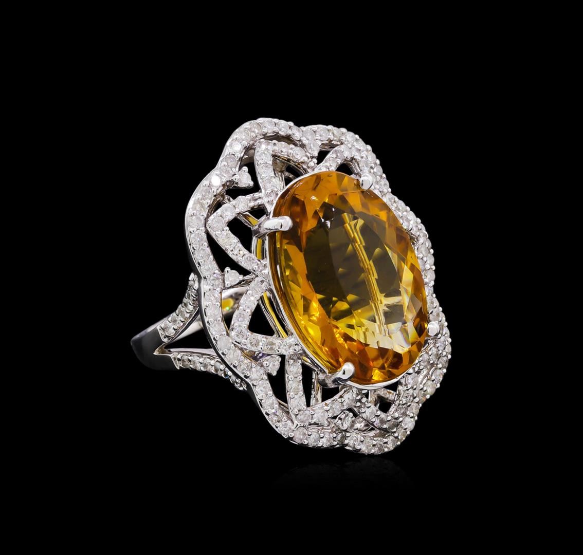One electronically tested 14KT white gold Ladies combination cast & assembled cocktail ring with a bright polish finish. Identified with markings of "14K". Condition is excellent. Containing: One prong set oval modified brilliant cut natural citrine quartz, measuring 18.20 x 13.00 x 8.40mm, approximate weight of 10.91ct., clarity is eye clean, type I, medium light, moderately strong, orangy yellow color, (GIA oY 4/4), cut is good. Colored gemstones are presumed to have been subjected to commonly used and possible undetectable color/clarity enhancement processes. One Hundred Forty-Six prong set round brilliant cut diamonds, measuring 1.30 - 1.30 x 0.78mm (depth est.) approximate total weight of 146 Stones = 1.32ct. Clarity of I-2 to I-3, Color of I - J. Total Weight of Colored Stones 10.91ct. Total Weight of Diamonds 1.32ct. Total Weight of Ring 10.80gm. GGL Appraised at $6,945.00.