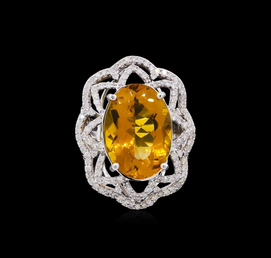 One electronically tested 14KT white gold Ladies combination cast & assembled cocktail ring with a bright polish finish. Identified with markings of "14K". Condition is excellent. Containing: One prong set oval modified brilliant cut natural citrine quartz, measuring 18.20 x 13.00 x 8.40mm, approximate weight of 10.91ct., clarity is eye clean, type I, medium light, moderately strong, orangy yellow color, (GIA oY 4/4), cut is good. Colored gemstones are presumed to have been subjected to commonly used and possible undetectable color/clarity enhancement processes. One Hundred Forty-Six prong set round brilliant cut diamonds, measuring 1.30 - 1.30 x 0.78mm (depth est.) approximate total weight of 146 Stones = 1.32ct. Clarity of I-2 to I-3, Color of I - J. Total Weight of Colored Stones 10.91ct. Total Weight of Diamonds 1.32ct. Total Weight of Ring 10.80gm. GGL Appraised at $6,945.00.