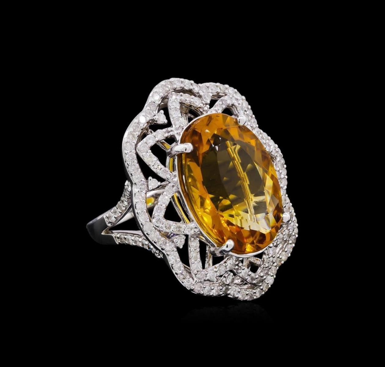 One electronically tested 14KT white gold Ladies combination cast & assembled cocktail ring with a bright polish finish. Identified with markings of "14K". Condition is excellent. Containing: One prong set oval modified brilliant cut natural citrine quartz, measuring 18.20 x 13.00 x 8.40mm, approximate weight of 10.91ct., clarity is eye clean, type I, medium light, moderately strong, orangy yellow color, (GIA oY 4/4), cut is good. Colored gemstones are presumed to have been subjected to commonly used and possible undetectable color/clarity enhancement processes. One Hundred Forty-Six prong set round brilliant cut diamonds, measuring 1.30 - 1.30 x 0.78mm (depth est.) approximate total weight of 146 Stones = 1.32ct. Clarity of I-2 to I-3, Color of I - J. Total Weight of Colored Stones 10.91ct. Total Weight of Diamonds 1.32ct. Total Weight of Ring 10.80gm. GGL Appraised.
