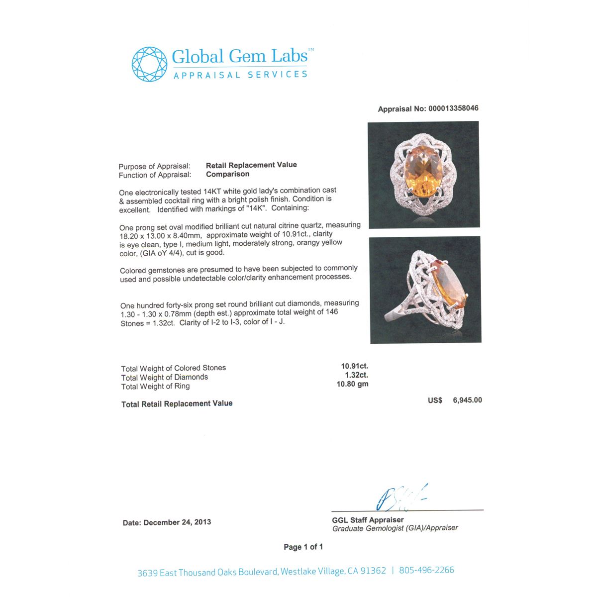 One electronically tested 14KT white gold Ladies combination cast & assembled cocktail ring with a bright polish finish. Identified with markings of "14K". Condition is excellent. Containing: One prong set oval modified brilliant cut natural citrine quartz, measuring 18.20 x 13.00 x 8.40mm, approximate weight of 10.91ct., clarity is eye clean, type I, medium light, moderately strong, orangy yellow color, (GIA oY 4/4), cut is good. Colored gemstones are presumed to have been subjected to commonly used and possible undetectable color/clarity enhancement processes. One Hundred Forty-Six prong set round brilliant cut diamonds, measuring 1.30 - 1.30 x 0.78mm (depth est.) approximate total weight of 146 Stones = 1.32ct. Clarity of I-2 to I-3, Color of I - J. Total Weight of Colored Stones 10.91ct. Total Weight of Diamonds 1.32ct. Total Weight of Ring 10.80gm. GGL Appraised at $6,945.00.