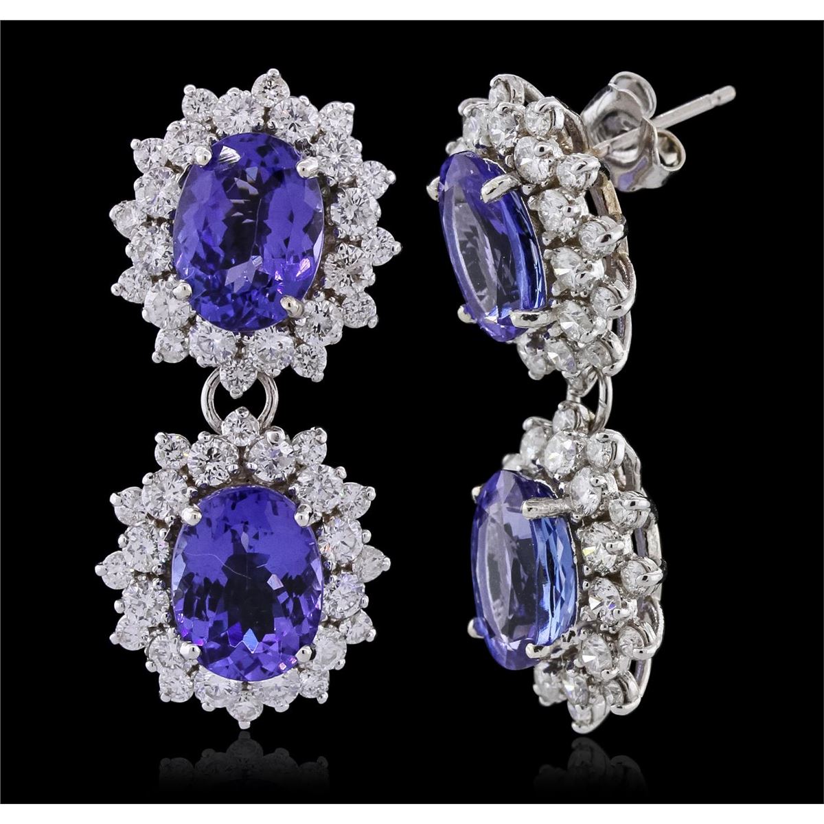 One pair electronically tested 14KT white gold ladies combination cast & assembled dangle earrings with friction posts with a bright polish finish. Identified with markings of "14K". Condition is new. Containing: Four prong set oval modified brilliant cut natural tanzanites, measuring 10.16 x 7.62 x 5.15mm, approximate total weight of 10.92ct., clarity is eye clean, type I, medium light, moderately strong, bluish violet color, (GIA bV 4/4), cut is good. Twelve prong set round brilliant cut diamonds, measuring 2.30 - 1.90 x 1.26mm (depth est.) approximate total weight of 12 Stones = 0.41ct. Clarity: SI-2 to I-1. Color: H - I, Cut is Good. Twelve prong set round brilliant cut diamonds, measuring 1.90 - 1.90 x 1.14mm (depth est.) approximate total weight of 12 Stones = 0.30ct. Clarity: SI-2 to I-1. Color: H - I, Cut is Good. Colored gemstones are presumed to have been subjected to commonly used enhancement processes. All diamonds and colored gemstones are graded in the mounting, unless otherwise stated. Total Weight of Colored Stones 10.92ct. Total Weight of Diamonds 0.71ct. Total Weight of Earrings 11.30 grams. GGL Appraised at $20,665.00.
