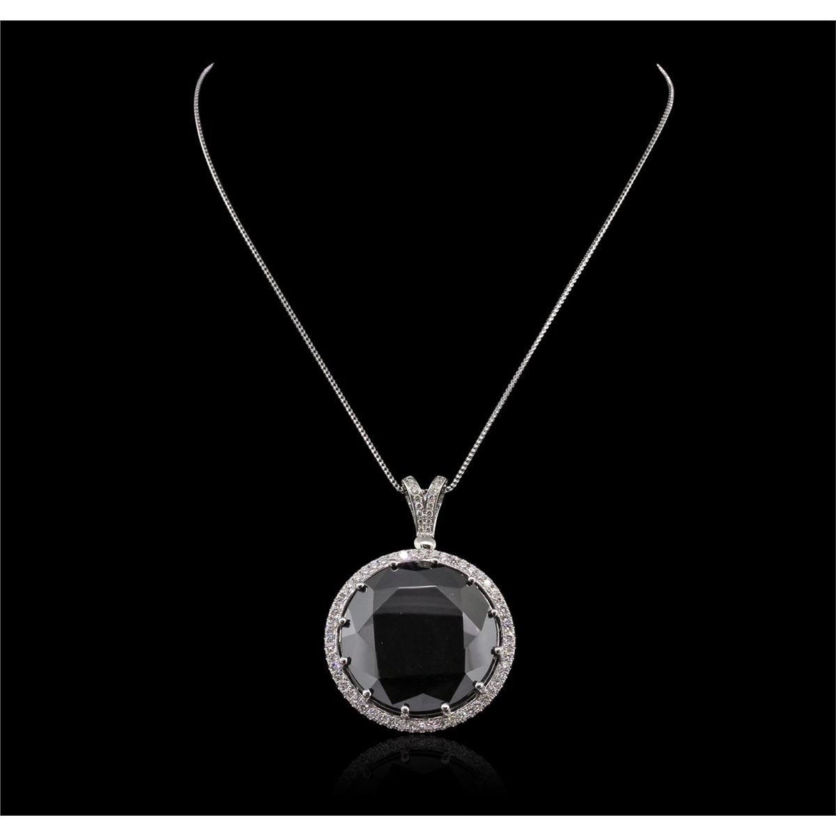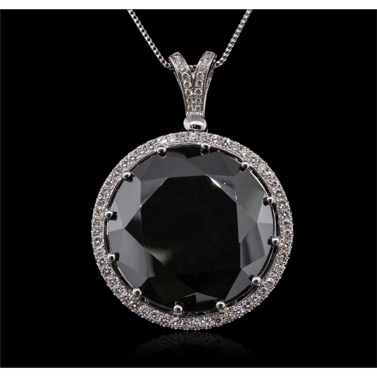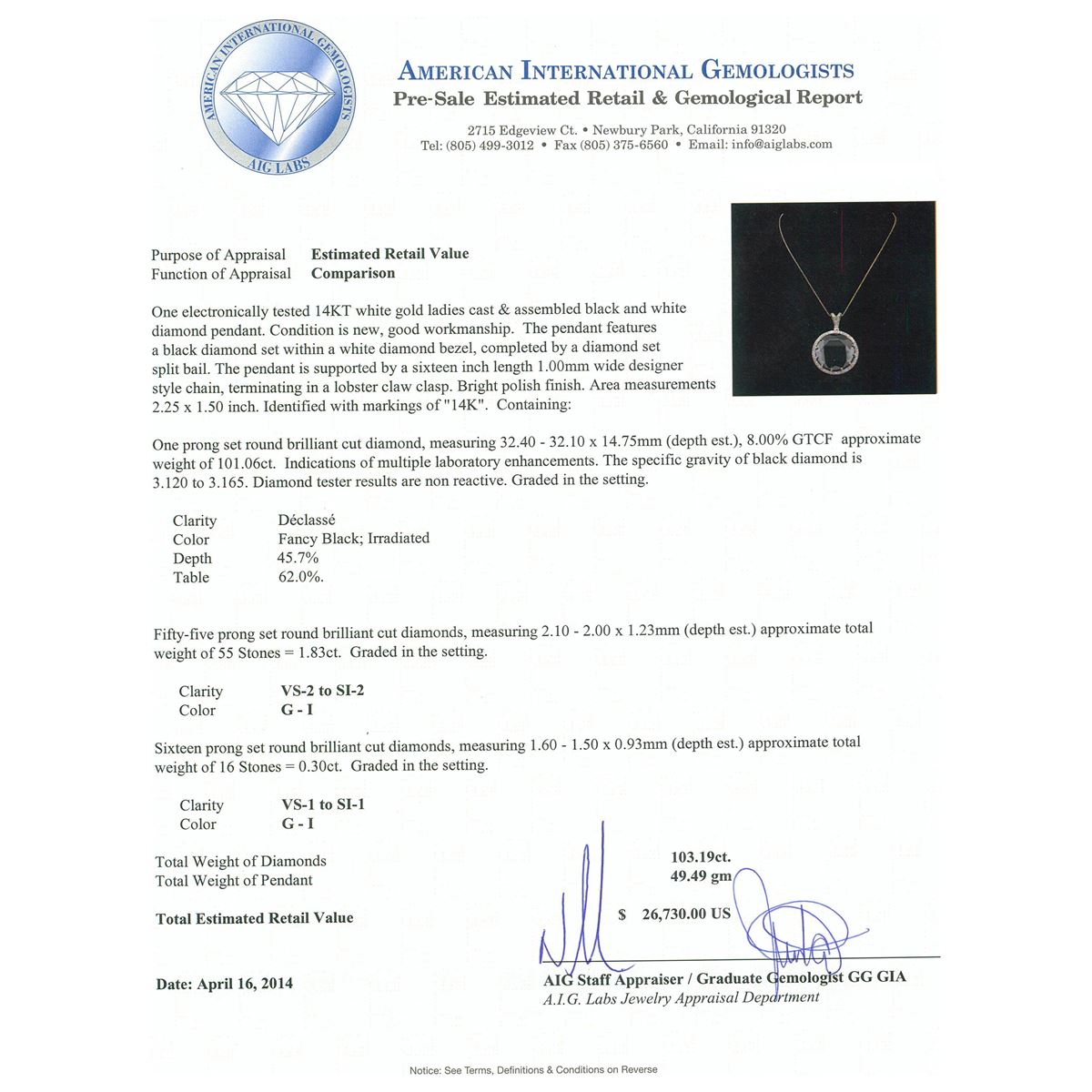One electronically tested 14KT white gold ladies cast & assembled black and white diamond pendant. Condition is new, good workmanship. The pendant features a black diamond set within a white diamond bezel, completed by a diamond set split bail. The pendant is supported by a sixteen inch length 1.00mm wide designer style chain, terminating in a lobster claw clasp. Bright polish finish. Area measurements 2.25 x 1.50 inch. Identified with markings of "14K". Containing: One prong set round brilliant cut diamond, measuring 32.40 - 32.10 x 14.75mm (depth est.), 8.00.%. GTCF approximate weight of 101.06ct. Indications of multiple laboratory enhancements. The specific gravity of black diamond is 3.120 to 3.165. Diamond tester results are non reactive. Graded in the setting. Clarity Declasse,. Color: Fancy Black; Irradiated. Depth: 45.7%. Table: 62.0%. Fifty-Five prong set round brilliant cut diamonds, measuring 2.10 - 2.00 x 1.23mm (depth est.) approximate. Total Weight of 55 Stones = 1.83ct. Graded in the setting. Clarity: VS-2 to SI-2. Color: G - I Sixteen prong set round brilliant cut diamonds, measuring 1.60 - 1.50 x 0.93mm (depth est.) approximate. Total Weight of 16 Stones = 0.30ct. Graded in the setting. Clarity: VS-1 to SI-1. Color: G - I. Total Weight of Diamonds103.19ct. Total Weight of Pendant 49.49 grams. AIG Appraised at $26,730.00.