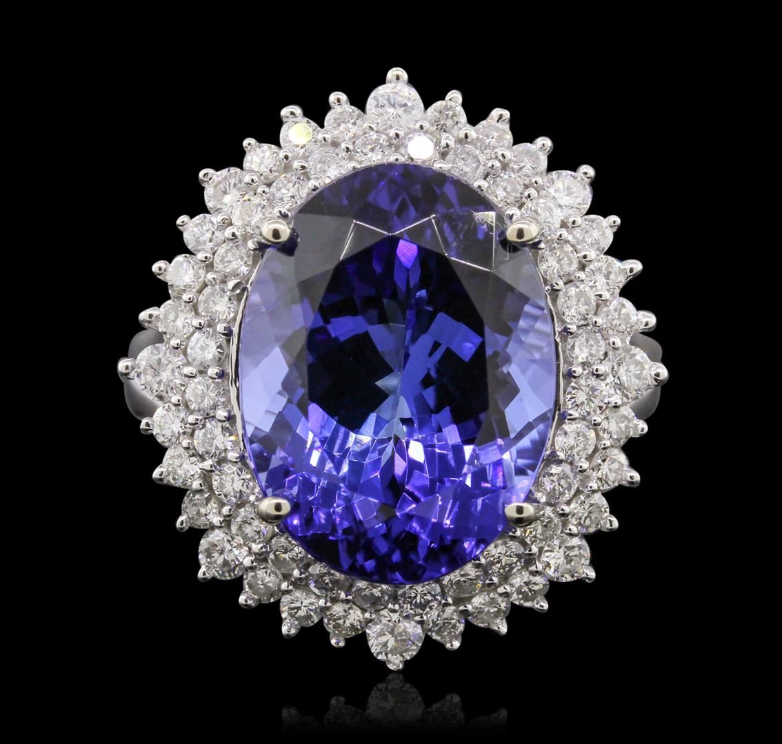 One electronically tested 14KT white gold Ladies combination cast & assembled fancy ring with a high polish finish. Condition is new. Identified with markings of "14K". Containing: Fifty-Seven prong set round brilliant cut diamonds, measuring 1.60 - 1.60 x 0.96mm (depth est.) approximate. Total Weight of 57 Stones = 1.18ct. Clarity: I-1 to I-2. Color: H - J, Cut is Good. One prong set oval modified brilliant cut natural tanzanite, measuring 15.76 x 11.77 x 8.62mm, approximate weight of 11.01ct., clarity is eye clean, type I, medium, moderately strong, violetish blue color, (GIA vB 5/4), cut is very good. GIA Report: 2151964581.Total Weight of Colored Stones 11.01ct. Total Weight of Diamonds 1.18ct. Total Weight of Ring 7.00 grams. GGL Appraised at $16,595.00.