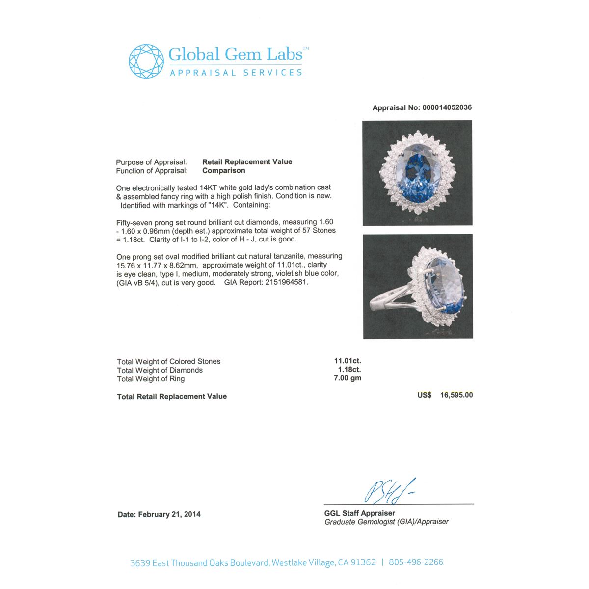 One electronically tested 14KT white gold Ladies combination cast & assembled fancy ring with a high polish finish. Condition is new. Identified with markings of "14K". Containing: Fifty-Seven prong set round brilliant cut diamonds, measuring 1.60 - 1.60 x 0.96mm (depth est.) approximate. Total Weight of 57 Stones = 1.18ct. Clarity: I-1 to I-2. Color: H - J, Cut is Good. One prong set oval modified brilliant cut natural tanzanite, measuring 15.76 x 11.77 x 8.62mm, approximate weight of 11.01ct., clarity is eye clean, type I, medium, moderately strong, violetish blue color, (GIA vB 5/4), cut is very good. GIA Report: 2151964581.Total Weight of Colored Stones 11.01ct. Total Weight of Diamonds 1.18ct. Total Weight of Ring 7.00 grams. GGL Appraised at $16,595.00.