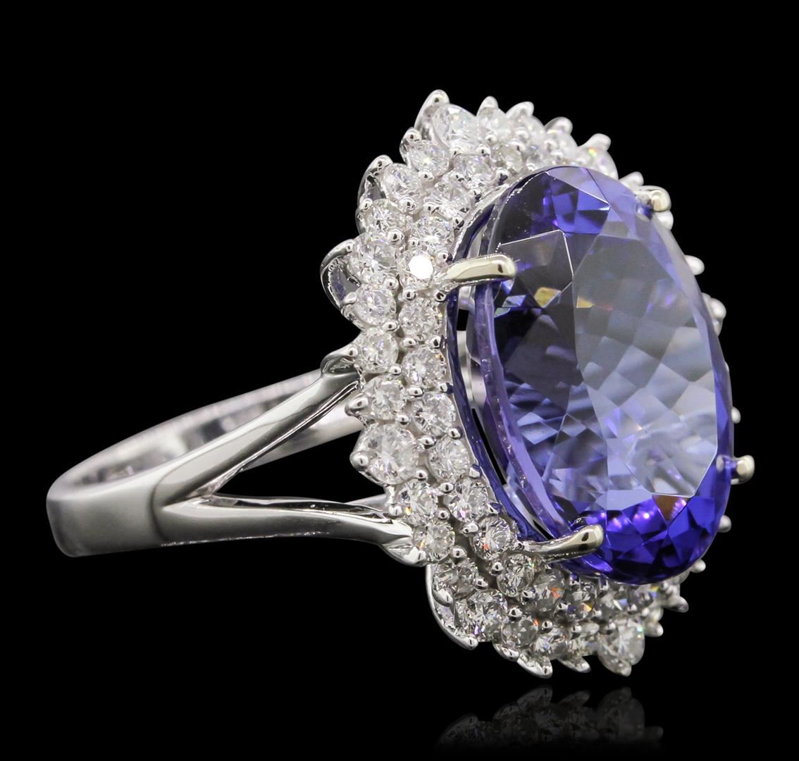 One electronically tested 14KT white gold Ladies combination cast & assembled fancy ring with a high polish finish. Condition is new. Identified with markings of "14K". Containing: Fifty-Seven prong set round brilliant cut diamonds, measuring 1.60 - 1.60 x 0.96mm (depth est.) approximate. Total Weight of 57 Stones = 1.18ct. Clarity: I-1 to I-2. Color: H - J, Cut is Good. One prong set oval modified brilliant cut natural tanzanite, measuring 15.76 x 11.77 x 8.62mm, approximate weight of 11.01ct., clarity is eye clean, type I, medium, moderately strong, violetish blue color, (GIA vB 5/4), cut is very good. GIA Report: 2151964581.Total Weight of Colored Stones 11.01ct. Total Weight of Diamonds 1.18ct. Total Weight of Ring 7.00 grams. GGL Appraised at $16,595.00.