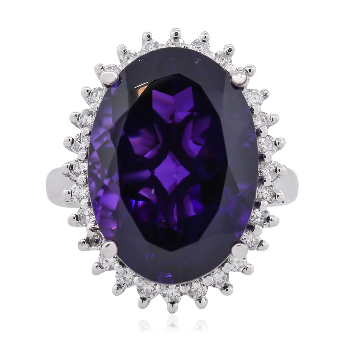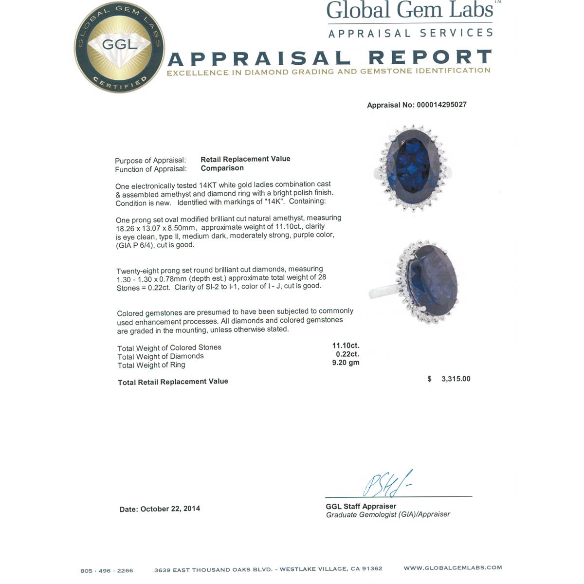 One electronically tested 14KT white gold ladies combination cast & assembled amethyst and diamond ring with a bright polish finish. Identified with markings of "14K". Condition is new. Containing: One prong set oval modified brilliant cut natural amethyst, measuring 18.26 x 13.07 x 8.50mm, approximate weight of 11.10ct., clarity is eye clean, type II, medium dark, moderately strong, purple color, (GIA P 6/4), cut is good. Twenty-Eight prong set round brilliant cut diamonds, measuring 1.30 - 1.30 x 0.78mm (depth est.) approximate total weight of 28 Stones = 0.22ct. Clarity: SI-2 to I-1. Color: I - J, Cut is Good. Colored gemstones are presumed to have been subjected to commonly used enhancement processes. All diamonds and colored gemstones are graded in the mounting, unless otherwise stated. Total Weight of Colored Stones 11.10ct. Total Weight of Diamonds 0.22ct. Total Weight of Ring 9.20 grams. GGL Appraised at $3,315.00.