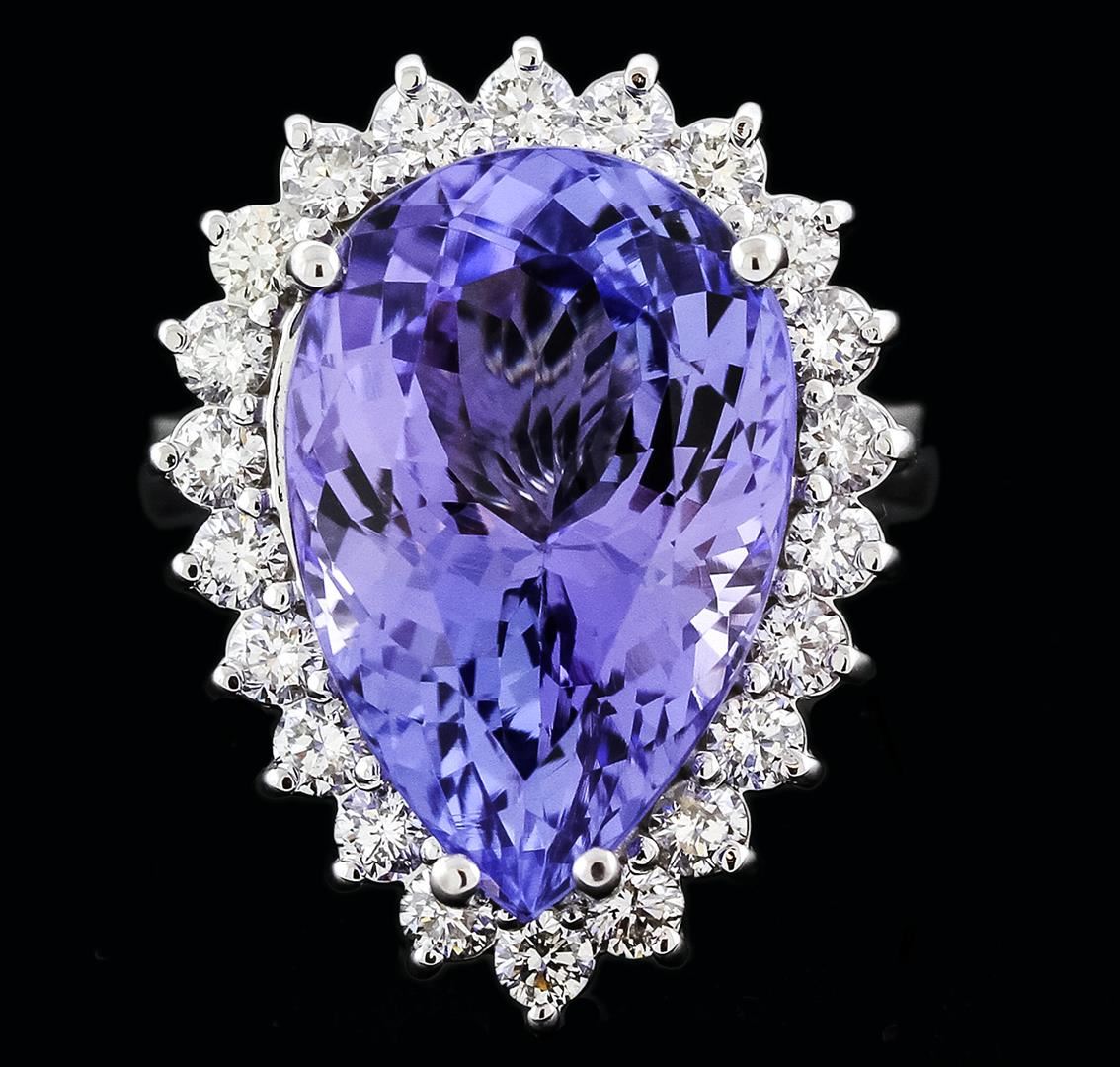 One electronically tested 14KT white gold ladies cast tanzanite and diamond ring with a bright polish finish. Identified with markings of "K14". Condition is new. Containing: One prong set pear modified brilliant cut natural tanzanite, measuring 17.80 x 12.00 x 7.81mm, approximate weight of 11.18ct., clarity is eye clean, type I, medium light, very slightly grayish, violet color, (GIA V 4/3), cut is good. Twenty-Two prong set round brilliant cut diamonds, measuring 2.20 - 2.20 x 1.32mm (depth est.) approximate. Total Weight of 22 Stones = 0.86ct. Clarity: SI-1 to SI-2. Color: I - J, Cut is Good. Colored gemstones are presumed to have been subjected to commonly used enhancement processes. All diamonds and colored gemstones are graded in the mounting, unless otherwise stated. Total Weight of Colored Stones 11.18ct. Total Weight of Diamonds 0.86ct. Total Weight of Ring 9.90 grams. GGL Appraised at $8,510.00.