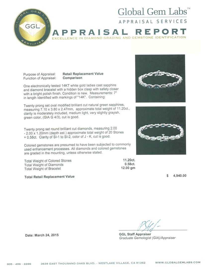 One electronically tested 14KT white gold ladies cast sapphire and diamond bracelet with a hidden box clasp with safety closer with a bright polish finish. Measurements: 7" in length Identified with markings of "14K". Condition is new. Containing: Twenty prong set oval modified brilliant cut natural green sapphires, measuring 7.10 x 3.80 x 2.47mm, approximate total weight of 11.20ct., clarity is moderately included, medium light, very slightly grayish, green color, (GIA G 4/3), cut is good. Twenty prong set round brilliant cut diamonds, measuring 2.00 - 2.00 x 1.20mm (depth est.) approximate total weight of 20 Stones = 0.58ct. Clarity: SI-1 to SI-2. Color: J - K, Cut is Good. Colored gemstones are presumed to have been subjected to commonly used enhancement processes. All diamonds and colored gemstones are graded in the mounting, unless otherwise stated. Total Weight of Colored Stones 11.20ct. Total Weight of Diamonds 0.58ct. Total Weight of Bracelet 12.00 grams. GGL Appraised at $4,940.00.