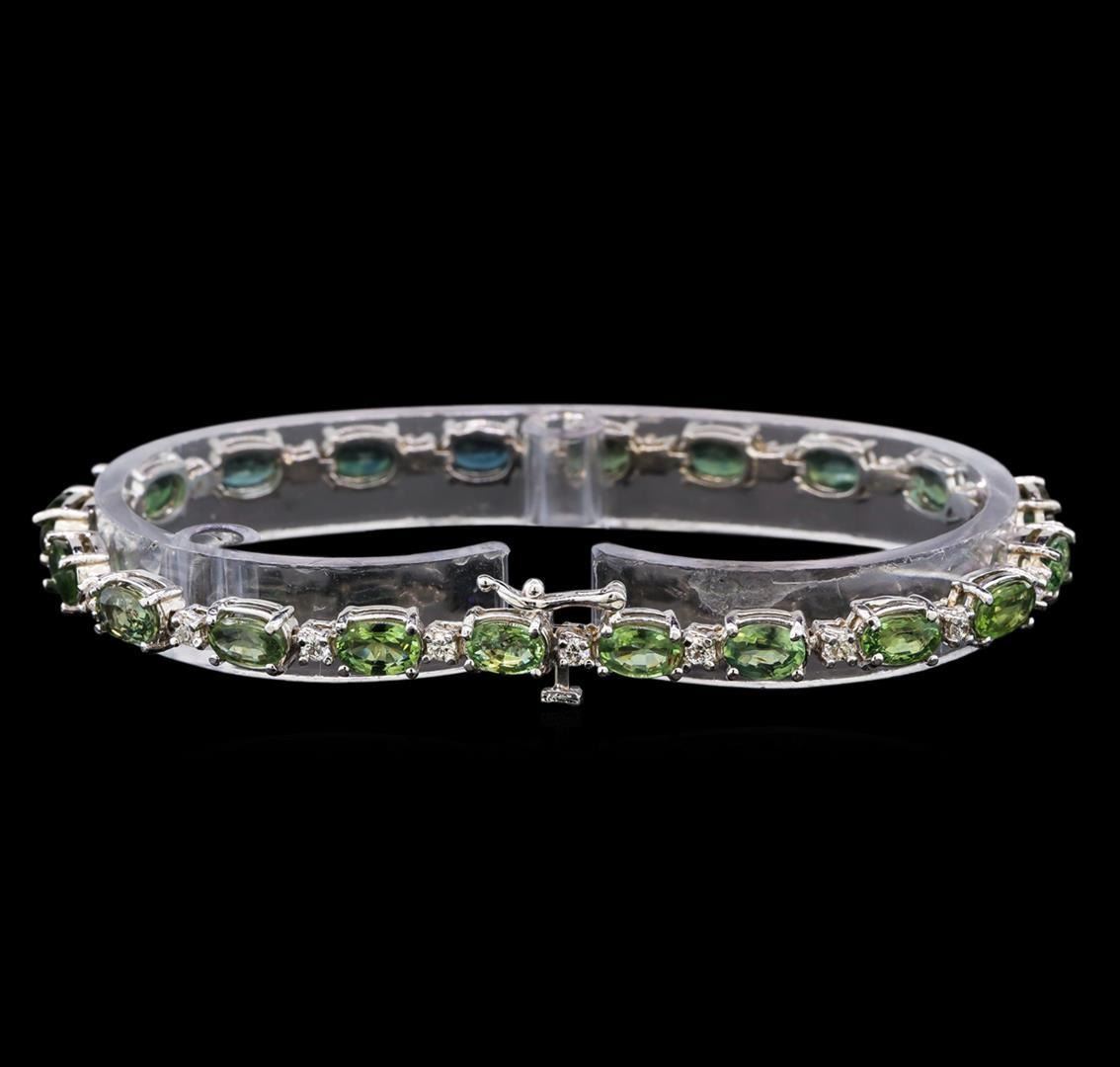 One electronically tested 14KT white gold ladies cast sapphire and diamond bracelet with a hidden box clasp with safety closer with a bright polish finish. Measurements: 7" in length Identified with markings of "14K". Condition is new. Containing: Twenty prong set oval modified brilliant cut natural green sapphires, measuring 7.10 x 3.80 x 2.47mm, approximate total weight of 11.20 ct., clarity is moderately included, medium light, very slightly grayish, green color, (GIA G 4/3), cut is good. Twenty prong set round brilliant cut diamonds, measuring 2.00 - 2.00 x 1.20mm (depth est.) approximate total weight of 20 Stones = 0.58ct. Clarity: SI-1 to SI-2. Color: J - K, Cut is Good. Colored gemstones are presumed to have been subjected to commonly used enhancement processes. All diamonds and colored gemstones are graded in the mounting, unless otherwise stated. Total Weight of Colored Stones 11.20 ct. Total Weight of Diamonds 0.58ct. Total Weight of Bracelet 12.00 grams. GGL Appraised.
