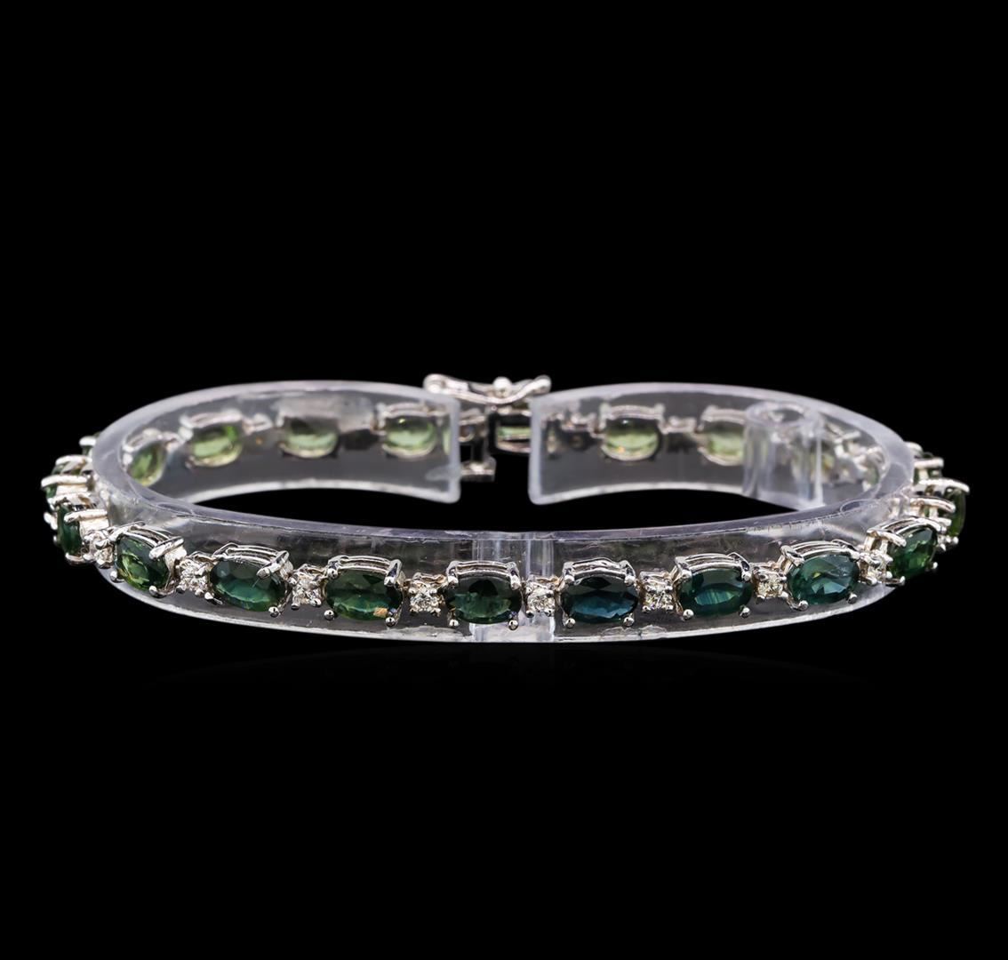 One electronically tested 14KT white gold ladies cast sapphire and diamond bracelet with a hidden box clasp with safety closer with a bright polish finish. Measurements: 7" in length Identified with markings of "14K". Condition is new. Containing: Twenty prong set oval modified brilliant cut natural green sapphires, measuring 7.10 x 3.80 x 2.47mm, approximate total weight of 11.20 ct., clarity is moderately included, medium light, very slightly grayish, green color, (GIA G 4/3), cut is good. Twenty prong set round brilliant cut diamonds, measuring 2.00 - 2.00 x 1.20mm (depth est.) approximate total weight of 20 Stones = 0.58ct. Clarity: SI-1 to SI-2. Color: J - K, Cut is Good. Colored gemstones are presumed to have been subjected to commonly used enhancement processes. All diamonds and colored gemstones are graded in the mounting, unless otherwise stated. Total Weight of Colored Stones 11.20 ct. Total Weight of Diamonds 0.58ct. Total Weight of Bracelet 12.00 grams. GGL Appraised.