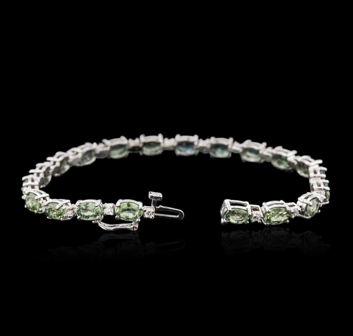 One electronically tested 14KT white gold ladies cast sapphire and diamond bracelet with a hidden box clasp with safety closer with a bright polish finish. Measurements: 7" in length Identified with markings of "14K". Condition is new. Containing: Twenty prong set oval modified brilliant cut natural green sapphires, measuring 7.10 x 3.80 x 2.47mm, approximate total weight of 11.20ct., clarity is moderately included, medium light, very slightly grayish, green color, (GIA G 4/3), cut is good. Twenty prong set round brilliant cut diamonds, measuring 2.00 - 2.00 x 1.20mm (depth est.) approximate total weight of 20 Stones = 0.58ct. Clarity: SI-1 to SI-2. Color: J - K, Cut is Good. Colored gemstones are presumed to have been subjected to commonly used enhancement processes. All diamonds and colored gemstones are graded in the mounting, unless otherwise stated. Total Weight of Colored Stones 11.20ct. Total Weight of Diamonds 0.58ct. Total Weight of Bracelet 12.00 grams. GGL Appraised at $4,940.00.