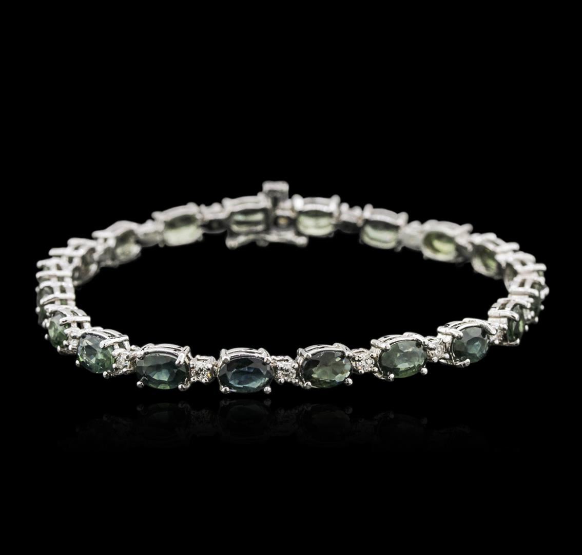 One electronically tested 14KT white gold ladies cast sapphire and diamond bracelet with a hidden box clasp with safety closer with a bright polish finish. Measurements: 7" in length Identified with markings of "14K". Condition is new. Containing: Twenty prong set oval modified brilliant cut natural green sapphires, measuring 7.10 x 3.80 x 2.47mm, approximate total weight of 11.20ct., clarity is moderately included, medium light, very slightly grayish, green color, (GIA G 4/3), cut is good. Twenty prong set round brilliant cut diamonds, measuring 2.00 - 2.00 x 1.20mm (depth est.) approximate total weight of 20 Stones = 0.58ct. Clarity: SI-1 to SI-2. Color: J - K, Cut is Good. Colored gemstones are presumed to have been subjected to commonly used enhancement processes. All diamonds and colored gemstones are graded in the mounting, unless otherwise stated. Total Weight of Colored Stones 11.20ct. Total Weight of Diamonds 0.58ct. Total Weight of Bracelet 12.00 grams. GGL Appraised at $4,940.00.