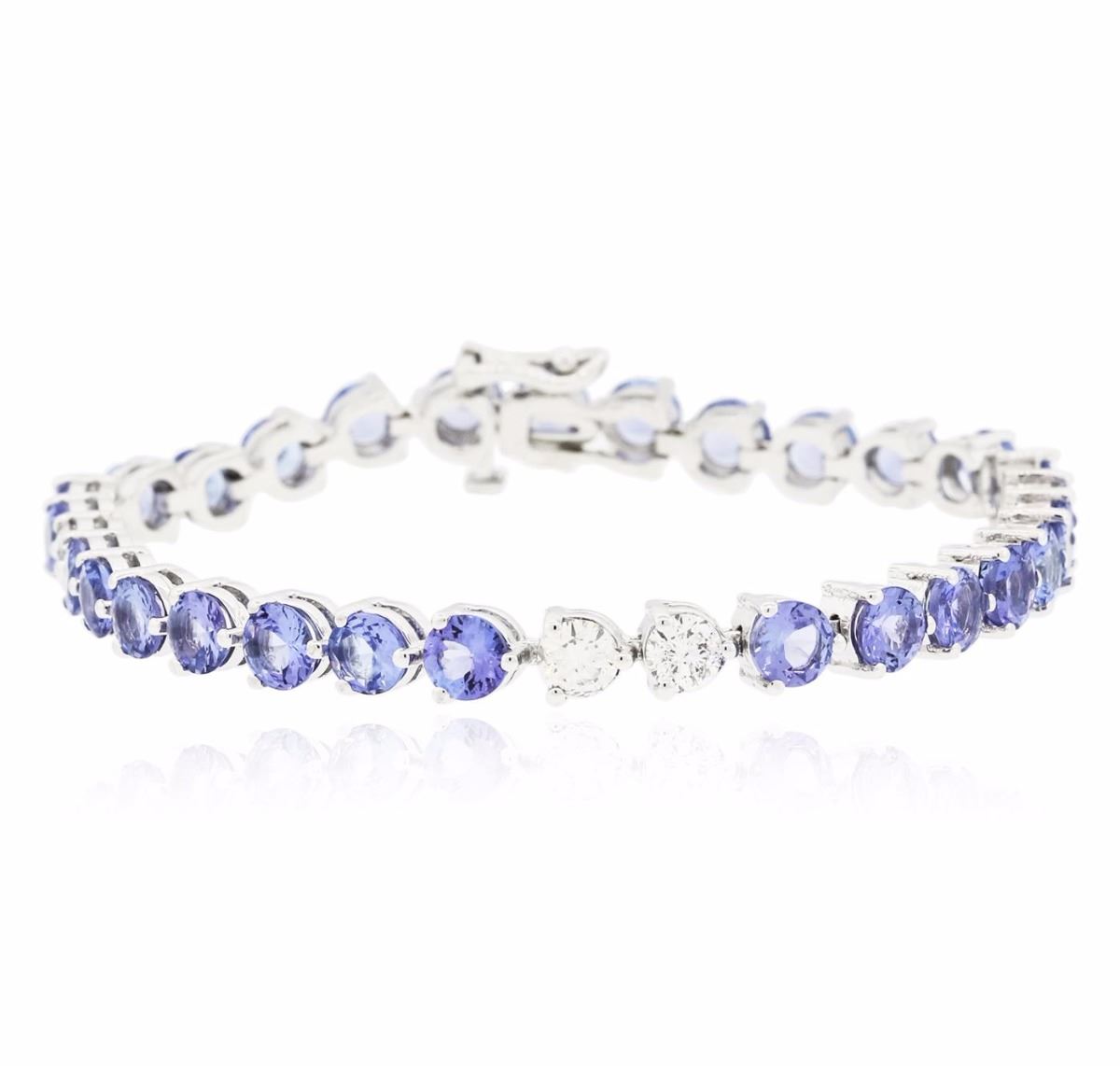 One electronically tested 14KT white gold ladies combination cast & assembled tanzanite and diamond bracelet with a hidden box clasp with a bright polish finish. Measurements: 7.25" in length. Identified with markings of "14K". Condition is new. Containing: Twenty-eight prong set round modified brilliant cut natural tanzanites, measuring 4.50 - 4.50 x 2.93 mm, approximate total weight of 11.20ct., clarity is eye clean, type I, medium light, moderately strong, violet color, (GIA V 4/4), cut is good. Four prong set round brilliant cut diamonds, measuring 4.50 - 4.50 x 2.70mm (depth est.) approximate total weight of 4 Stones = 1.33ct. Clarity: I-1. Color: I - J, Cut is Good. Colored gemstones are presumed to have been subjected to commonly used enhancement processes. All diamonds and colored gemstones are graded in the mounting, unless otherwise stated. Total Weight of Colored Stones 11.20ct. Total Weight of Diamonds 1.33ct. Total Weight of Bracelet 16.30 grams. GGL Appraised at $12,595.00.