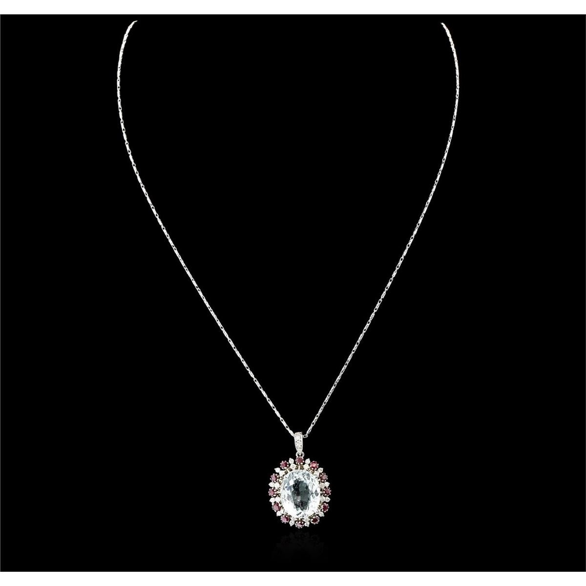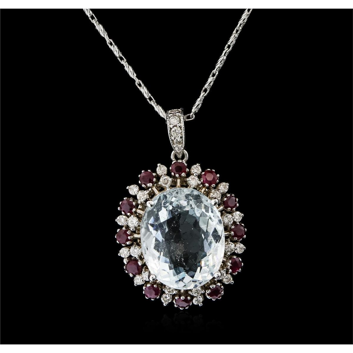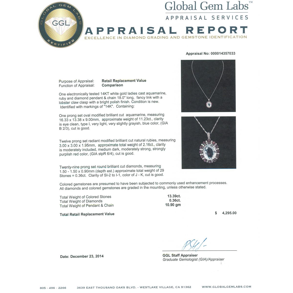 One electronically tested 14KT white gold ladies cast aquamarine, ruby and diamond pendant & chain 18.0" long, fancy link with a lobster claw clasp with a bright polish finish. Identified with markings of "14K". Condition is new. Containing: One prong set oval modified brilliant cut aquamarine, measuring 16.33 x 13.38 x 9.00mm, approximate weight of 11.23ct., clarity is eye clean, type I, very light, very slightly grayish, blue color, (GIA B 2/3), cut is good. Twelve prong set radiant modified brilliant cut natural rubies, measuring 3.00 x 3.00 x 1.95mm, approximate total weight of 2.16ct., clarity is moderately included, medium dark, moderately strong, strongly purplish red color, (GIA stpR 6/4), cut is good. Twenty-Nine prong set round brilliant cut diamonds, measuring 1.50 - 1.50 x 0.90mm (depth est.) approximate total weight of 29 Stones = 0.36ct. Clarity: SI-2 to I-1. Color: J - K, Cut is Good. Colored gemstones are presumed to have been subjected to commonly used enhancement processes. All diamonds and colored gemstones are graded in the mounting, unless otherwise stated. Total Weight of Colored Stones 13.39ct. Total Weight of Diamonds 0.36ct. Total Weight of Pendant & Chain 10.90 grams. GGL Appraised at $4,295.00.