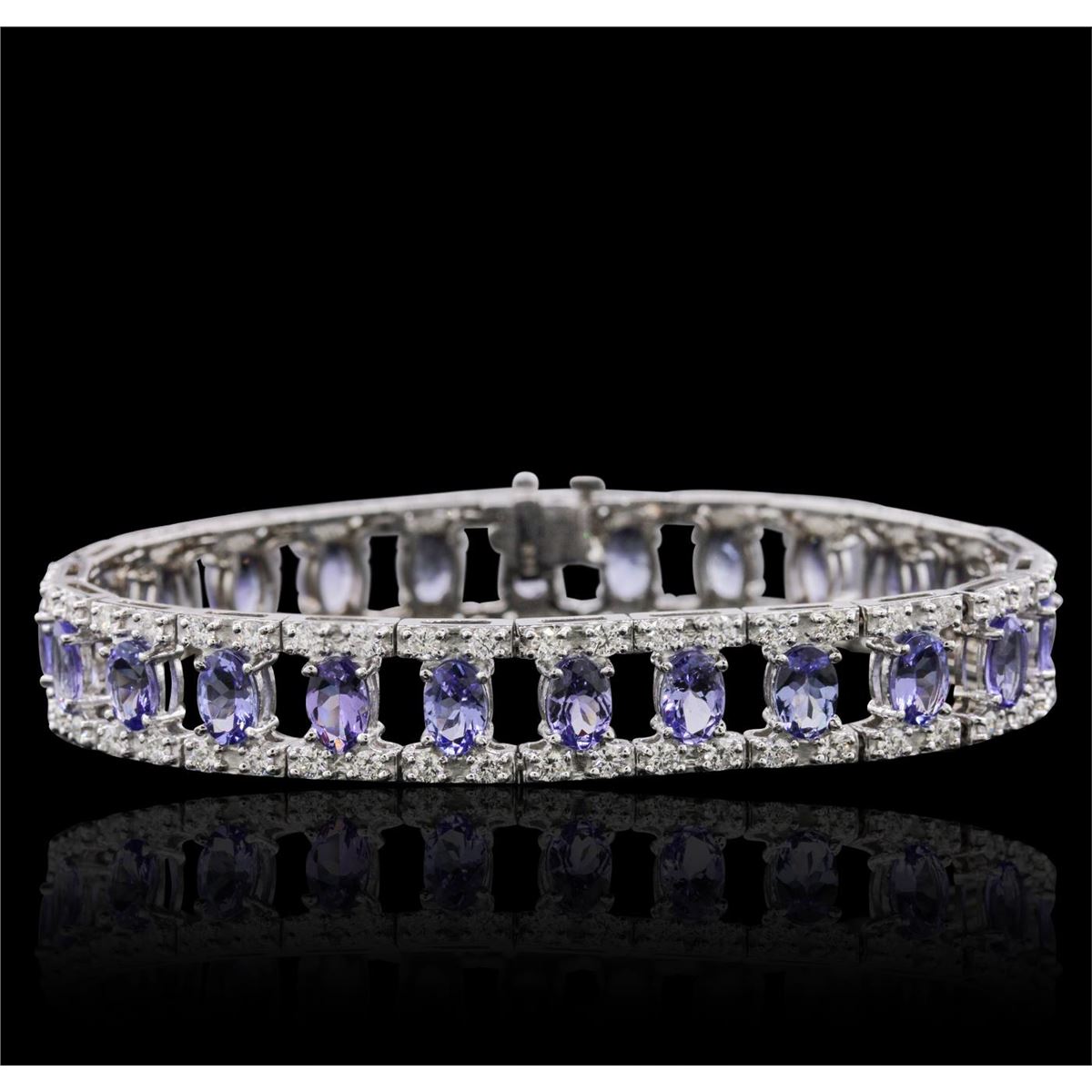 One electronically tested 14KT white gold ladies combination cast & assembled tanzanite and diamond bracelet with a hidden box clasp with a bright polish finish. Measurements: 7" in length. Identified with markings of "14K". Condition is new. Containing: Twenty-five prong set oval modified brilliant cut natural tanzanites, measuring 5.88 x 4.15 x 2.69mm, approximate total weight of 11.25ct., clarity is eye clean, type I, medium, moderately strong, violet color, (GIA V 5/4), cut is good. One Hundred prong set round brilliant cut diamonds, measuring 1.50 - 1.50 x 0.90mm (depth est.) approximate total weight of 100 Stones = 1.23ct. Clarity: SI-2 to I-2. Color: I - J, Cut is Good. Colored gemstones are presumed to have been subjected to commonly used enhancement processes. All diamonds and colored gemstones are graded in the mounting, unless otherwise stated. Total Weight of Colored Stones 11.25ct. Total Weight of Diamonds 1.23ct. Total Weight of Bracelet 22.60 grams. GGL Appraised at $19,135.00.