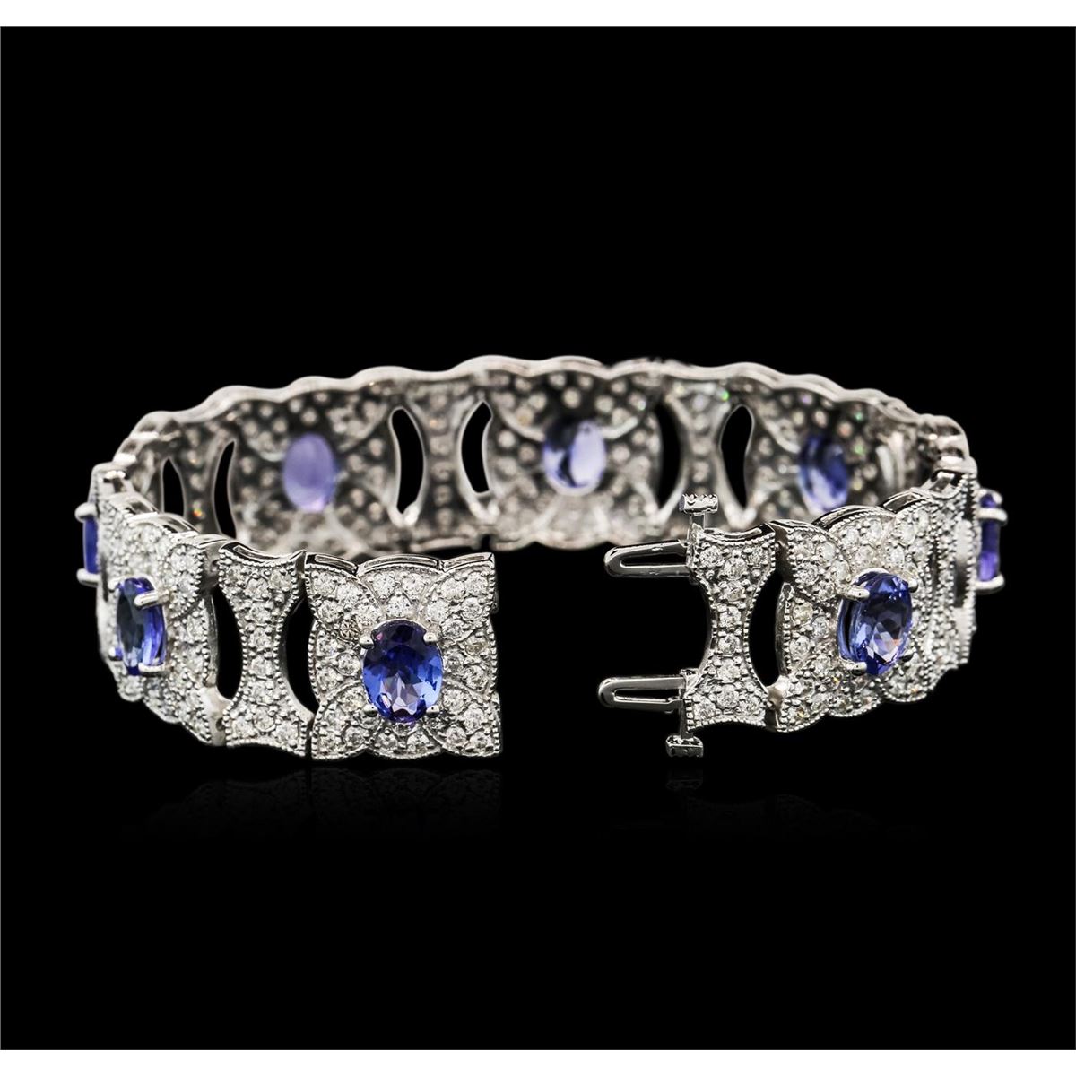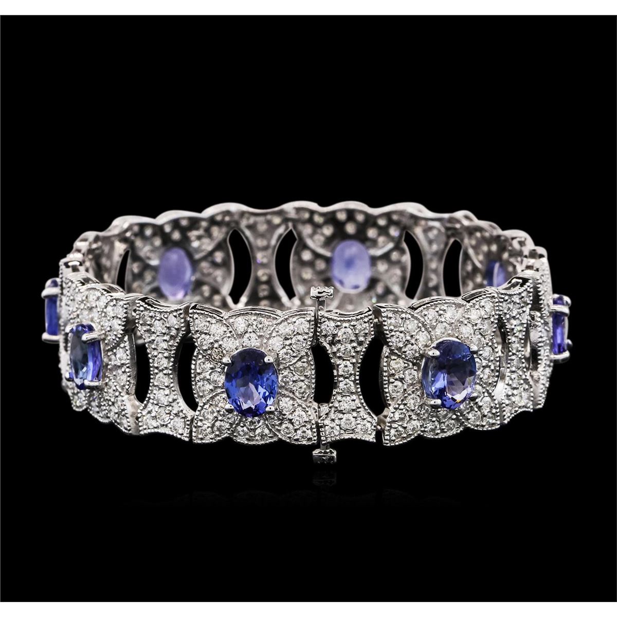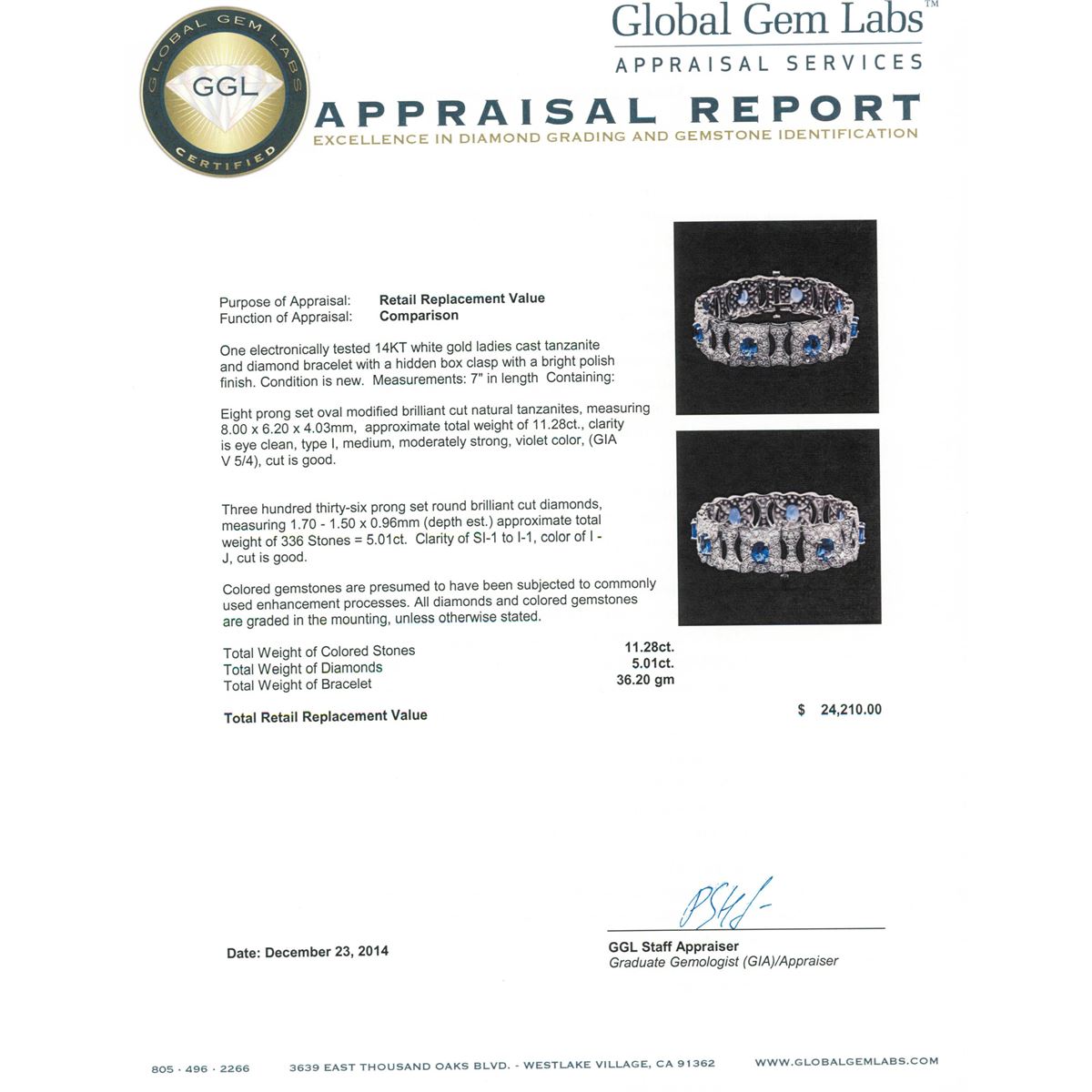 One electronically tested 14KT white gold ladies cast tanzanite and diamond bracelet with a hidden box clasp with a bright polish finish. Measurements: 7" in length Condition is new. Containing: Eight prong set oval modified brilliant cut natural tanzanites, measuring 8.00 x 6.20 x 4.03mm, approximate total weight of 11.28ct., clarity is eye clean, type I, medium, moderately strong, violet color, (GIA V 5/4), cut is good. Three Hundred Thirty-Six prong set round brilliant cut diamonds, measuring 1.70 - 1.50 x 0.96mm (depth est.) approximate total weight of 336 Stones = 5.01ct. Clarity: SI-1 to I-1. Color: I - J, Cut is Good. Colored gemstones are presumed to have been subjected to commonly used enhancement processes. All diamonds and colored gemstones are graded in the mounting, unless otherwise stated. Total Weight of Colored Stones 11.28ct. Total Weight of Diamonds 5.01ct. Total Weight of Bracelet 36.20 grams. GGL Appraised at $24,210.00.