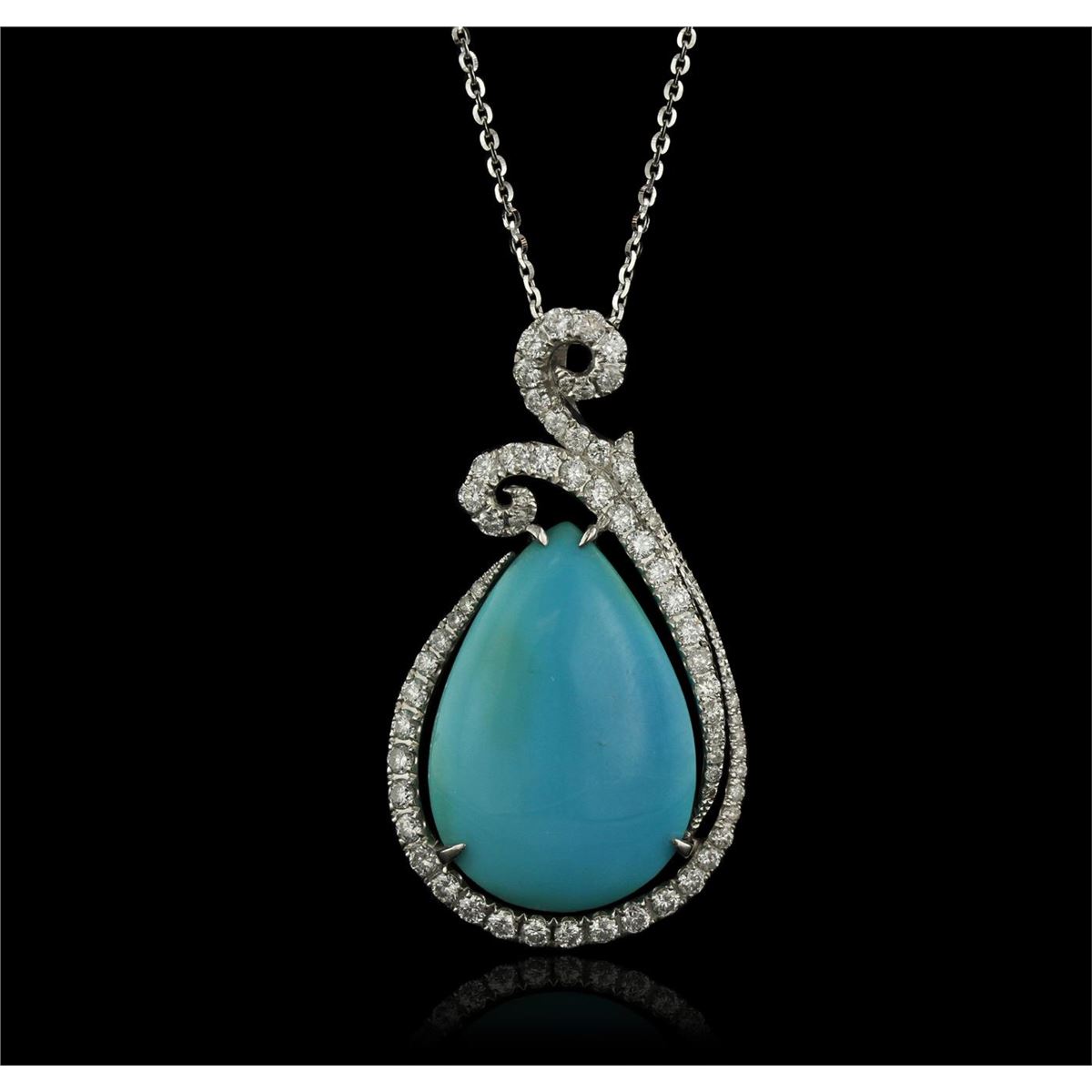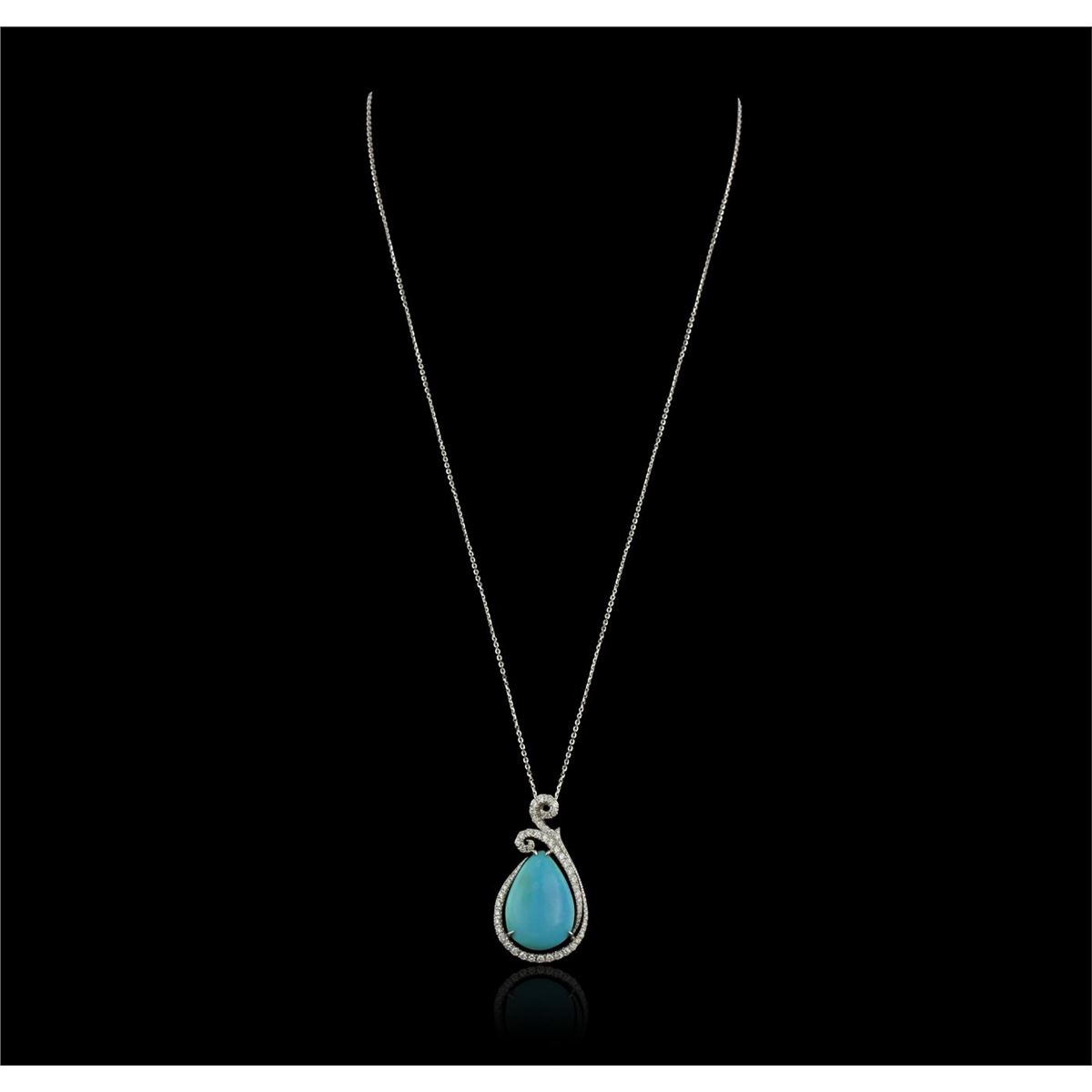 One electronically tested 14KT white gold Ladies pendant & chain 17.5" long, small fancy cable link with a spring ring clasp with a bright polish finish. Condition is new. Identified with markings of "585". Containing: One prong set pear cut natural turquoise, measuring 21.45 x 14.73 x 5.60mm, approximate weight of 11.29ct., clarity is severely included, medium light, moderately strong, blue color, (GIA B 4/4), cut is good. Colored gemstones are presumed to have been subjected to commonly used color/clarity enhancement processes. Thirty-Three bead set round brilliant cut diamonds, measuring 1.30 - 1.30 x 0.78mm (depth est.) approximate. Total Weight of 33 Stones = 0.26ct. Clarity: I-1 to I-2. Color: G - H, Cut is Good. Thirty-One bead set round brilliant cut diamonds, measuring 1.80 - 1.80 x 1.08mm (depth est.) approximate. Total Weight of 31 Stones = 0.61ct. Clarity: SI-2 to I-1. Color: G - H, Cut is Good. Total Weight of Colored Stones 11.29ct. Total Weight of Diamonds 0.87ct. Total Weight of Pendant & Chain 7.30 grams. GGL Appraised at $8,130.00.