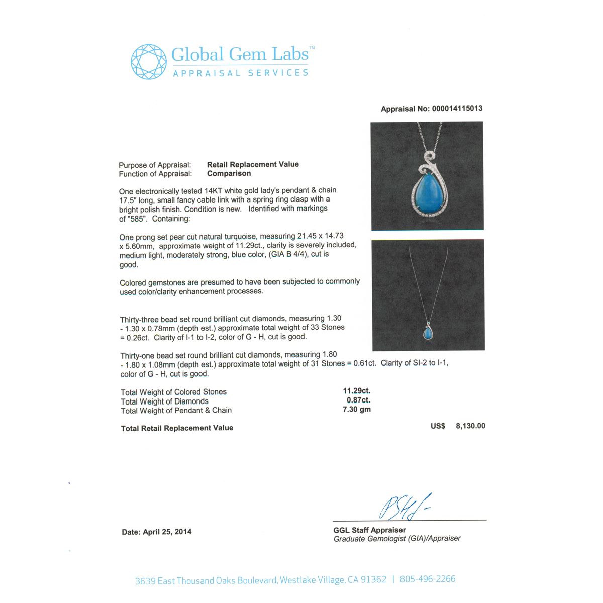 One electronically tested 14KT white gold Ladies pendant & chain 17.5" long, small fancy cable link with a spring ring clasp with a bright polish finish. Condition is new. Identified with markings of "585". Containing: One prong set pear cut natural turquoise, measuring 21.45 x 14.73 x 5.60mm, approximate weight of 11.29ct., clarity is severely included, medium light, moderately strong, blue color, (GIA B 4/4), cut is good. Colored gemstones are presumed to have been subjected to commonly used color/clarity enhancement processes. Thirty-Three bead set round brilliant cut diamonds, measuring 1.30 - 1.30 x 0.78mm (depth est.) approximate. Total Weight of 33 Stones = 0.26ct. Clarity: I-1 to I-2. Color: G - H, Cut is Good. Thirty-One bead set round brilliant cut diamonds, measuring 1.80 - 1.80 x 1.08mm (depth est.) approximate. Total Weight of 31 Stones = 0.61ct. Clarity: SI-2 to I-1. Color: G - H, Cut is Good. Total Weight of Colored Stones 11.29ct. Total Weight of Diamonds 0.87ct. Total Weight of Pendant & Chain 7.30 grams. GGL Appraised at $8,130.00.