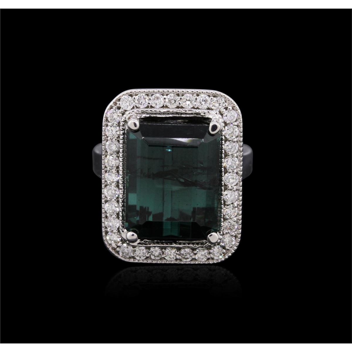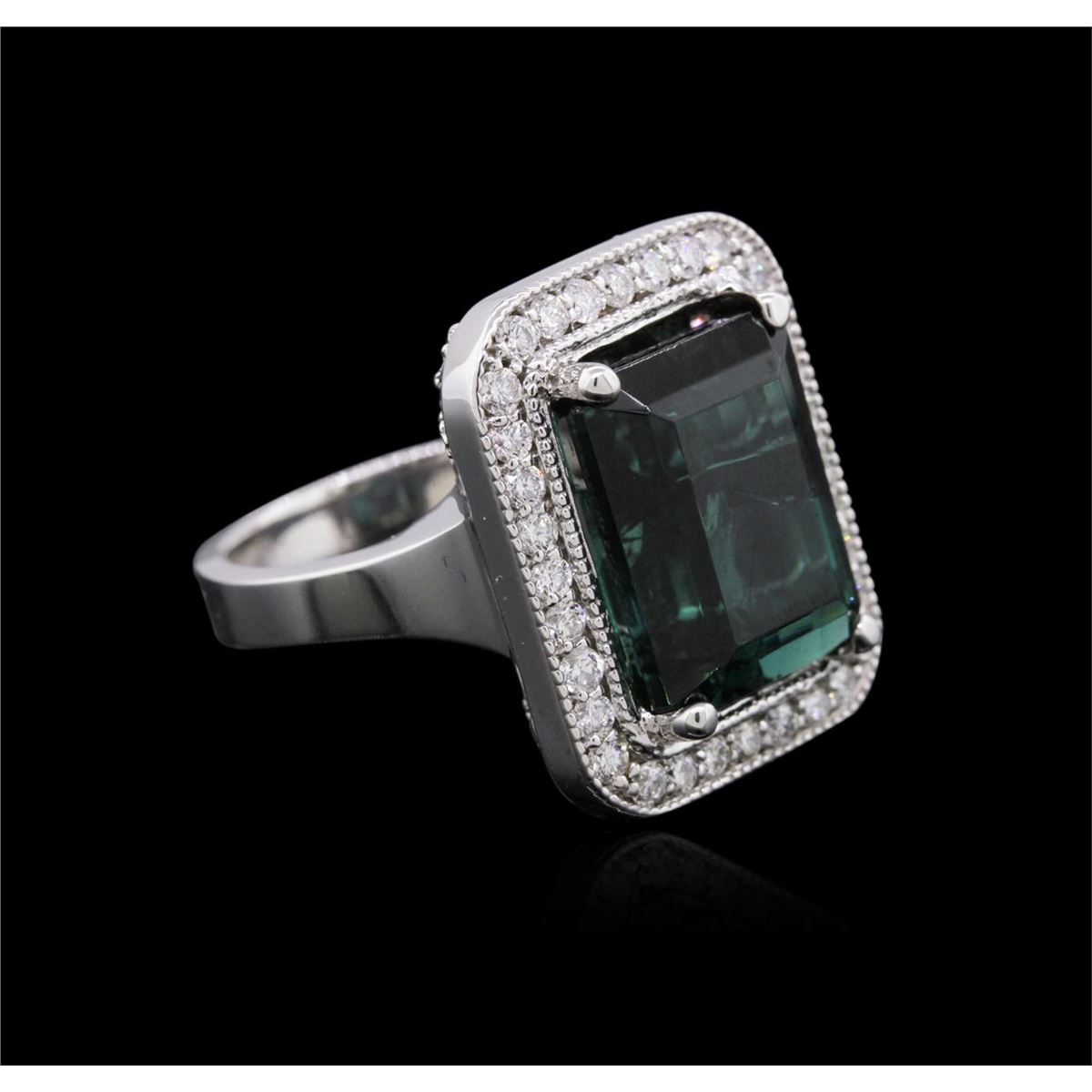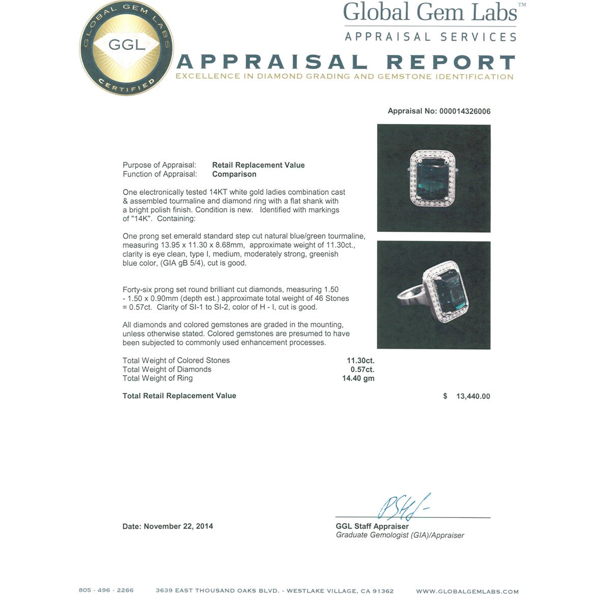 One electronically tested 14KT white gold ladies combination cast & assembled tourmaline and diamond ring with a flat shank with a bright polish finish. Identified with markings of "14K". Condition is new. Containing: One prong set emerald standard step cut natural blue/green tourmaline, measuring 13.95 x 11.30 x 8.68mm, approximate weight of 11.30ct., clarity is eye clean, type I, medium, moderately strong, greenish blue color, (GIA gB 5/4), cut is good. Forty-Six prong set round brilliant cut diamonds, measuring 1.50 - 1.50 x 0.90mm (depth est.) approximate total weight of 46 Stones = 0.57ct. Clarity: SI-1 to SI-2. Color: H - I, Cut is Good. All diamonds and colored gemstones are graded in the mounting, unless otherwise stated. Colored gemstones are presumed to have been subjected to commonly used enhancement processes. Total Weight of Colored Stones 11.30ct. Total Weight of Diamonds 0.57ct. Total Weight of Ring 14.40 grams. GGL Appraised at $13,440.00.
