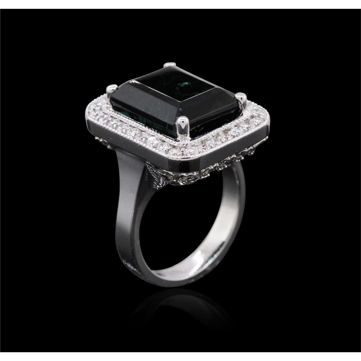 One electronically tested 14KT white gold ladies combination cast & assembled tourmaline and diamond ring with a flat shank with a bright polish finish. Identified with markings of "14K". Condition is new. Containing: One prong set emerald standard step cut natural blue/green tourmaline, measuring 13.95 x 11.30 x 8.68mm, approximate weight of 11.30ct., clarity is eye clean, type I, medium, moderately strong, greenish blue color, (GIA gB 5/4), cut is good. Forty-Six prong set round brilliant cut diamonds, measuring 1.50 - 1.50 x 0.90mm (depth est.) approximate total weight of 46 Stones = 0.57ct. Clarity: SI-1 to SI-2. Color: H - I, Cut is Good. All diamonds and colored gemstones are graded in the mounting, unless otherwise stated. Colored gemstones are presumed to have been subjected to commonly used enhancement processes. Total Weight of Colored Stones 11.30ct. Total Weight of Diamonds 0.57ct. Total Weight of Ring 14.40 grams. GGL Appraised at $13,440.00.