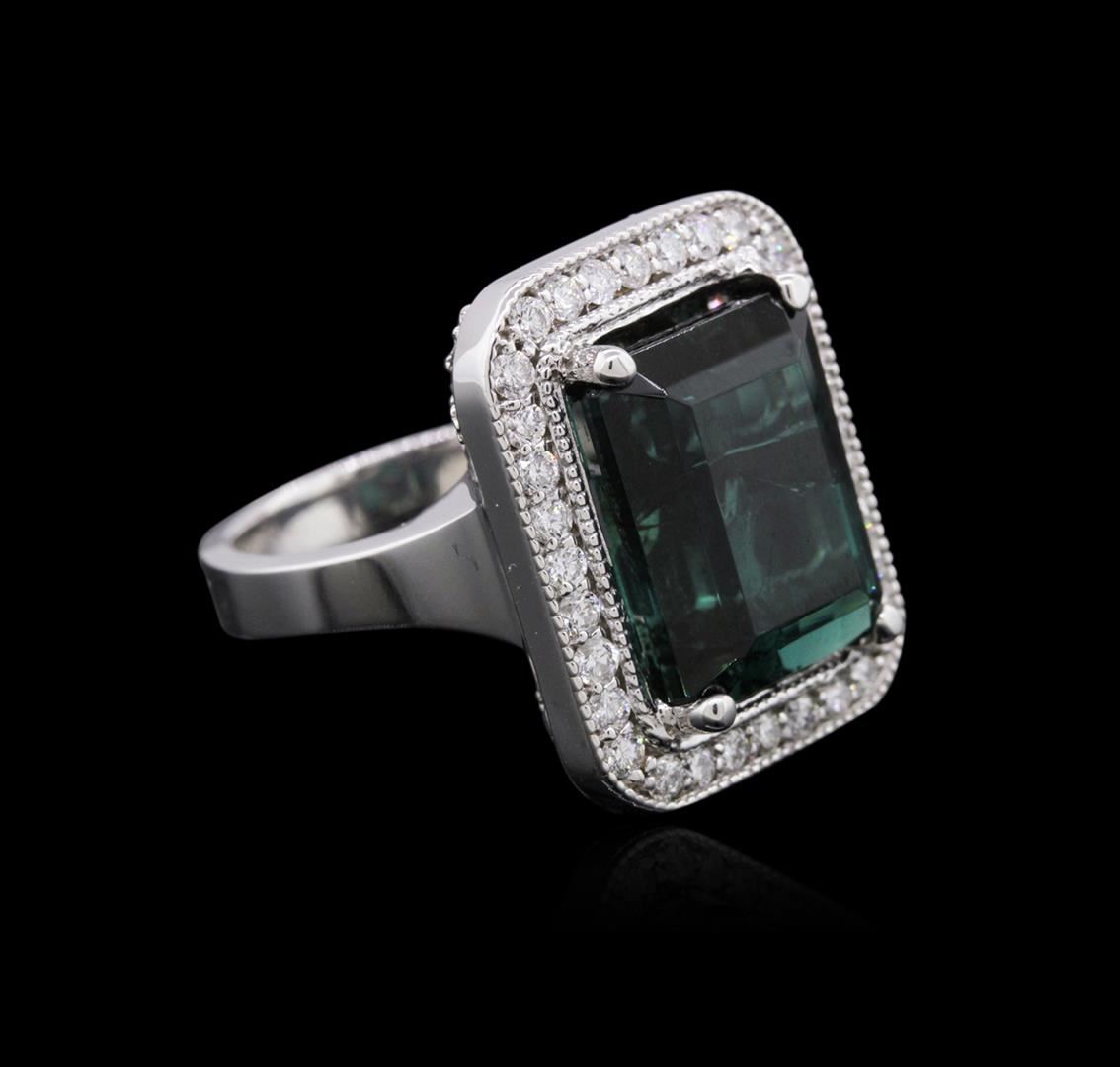 One electronically tested 14KT white gold ladies combination cast & assembled tourmaline and diamond ring with a flat shank with a bright polish finish. Identified with markings of "14K". Condition is new. Containing: One prong set emerald standard step cut natural blue/green tourmaline, measuring 13.95 x 11.30 x 8.68mm, approximate weight of 11.30ct., clarity is eye clean, type I, medium, moderately strong, greenish blue color, (GIA gB 5/4), cut is good. Forty-Six prong set round brilliant cut diamonds, measuring 1.50 - 1.50 x 0.90mm (depth est.) approximate total weight of 46 Stones = 0.57ct. Clarity: SI-1 to SI-2. Color: H - I, Cut is Good. All diamonds and colored gemstones are graded in the mounting, unless otherwise stated. Colored gemstones are presumed to have been subjected to commonly used enhancement processes. Total Weight of Colored Stones 11.30ct. Total Weight of Diamonds 0.57ct. Total Weight of Ring 14.40 grams. GGL Appraised at $13,440.00.